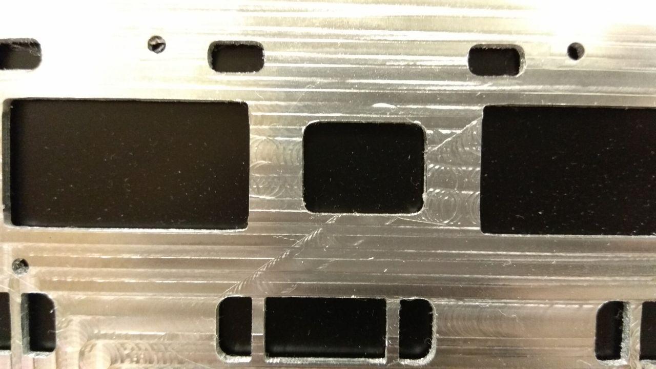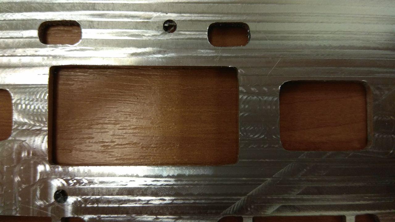 Как видно, вместо прямоугольных "окошек" получились бочкообразные. Плюс, углы не "совпадают". Поясню. Стратегия обработки этих окошек такая: выборка контура 6 мм фрезой с заглублением по 0.5 мм, затем проход контура на всю глубину фрезой 4 мм, и для некоторых окошек так же дополнительно фрезами 2 мм и 1 мм. В результате, видно очень явно, углы получаются смещёнными, что ли. Причём, такое с углами и при применении Rest Machininig (когда обрабатывается только то, что осталось после фрезы 6 мм), и без него (когда идёт проход по полному контуру).