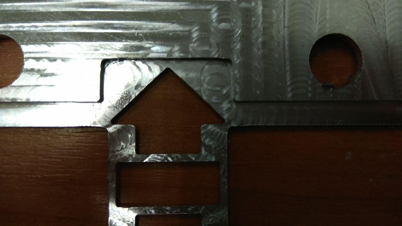 Как видно, вместо прямоугольных "окошек" получились бочкообразные. Плюс, углы не "совпадают". Поясню. Стратегия обработки этих окошек такая: выборка контура 6 мм фрезой с заглублением по 0.5 мм, затем проход контура на всю глубину фрезой 4 мм, и для некоторых окошек так же дополнительно фрезами 2 мм и 1 мм. В результате, видно очень явно, углы получаются смещёнными, что ли. Причём, такое с углами и при применении Rest Machininig (когда обрабатывается только то, что осталось после фрезы 6 мм), и без него (когда идёт проход по полному контуру).