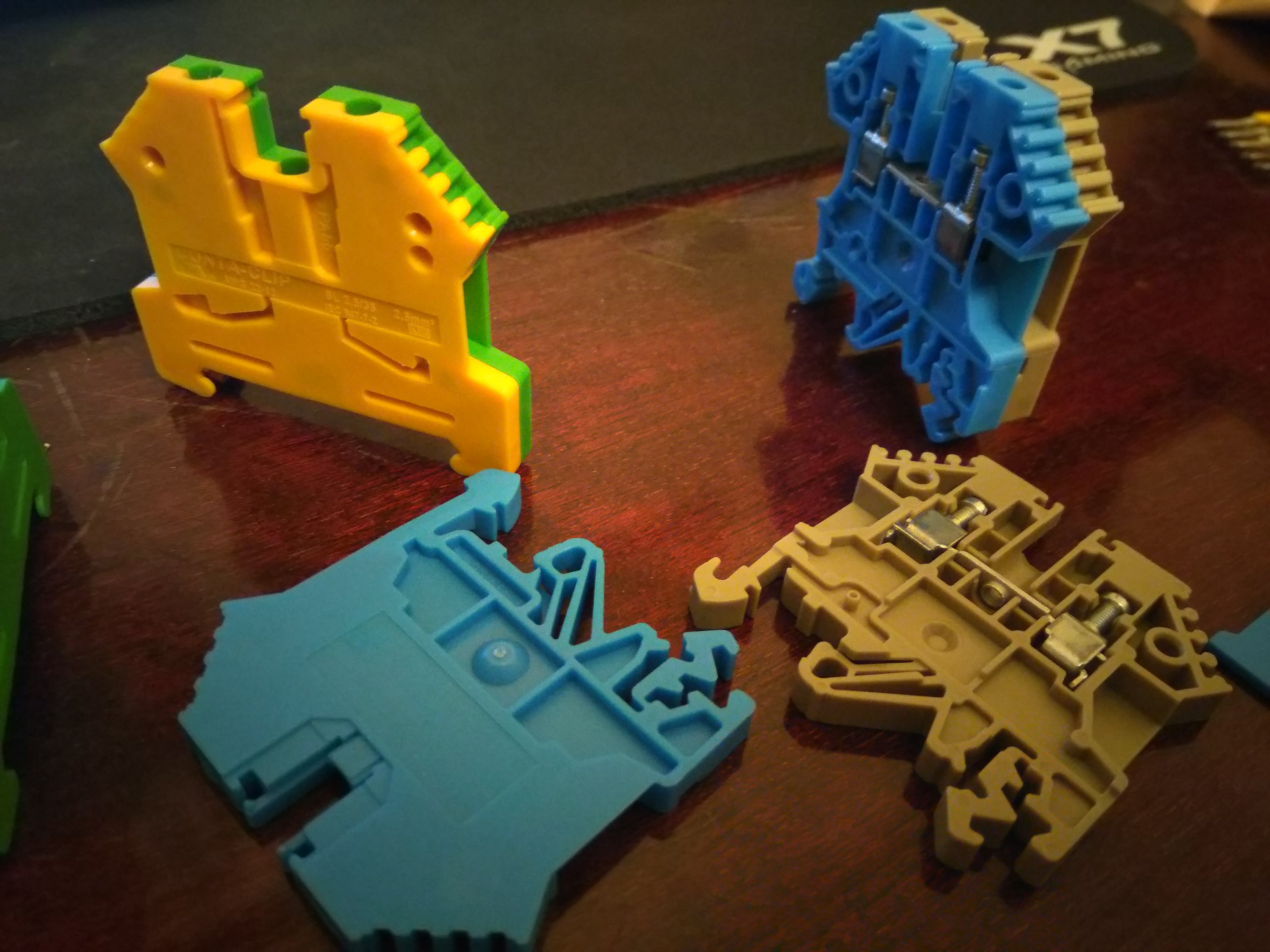 зы: на всякий случай - вот те которые "желто-зеленые" - они имеют контакт зацепленный на крепеж к дин-рейке.. они "земляные". обращаю внимание на всякий случай, потому как видел как их использовали в виде обычных терминалов, а потом сильно удивлялись что нифига не включается, и автомат выбивает...