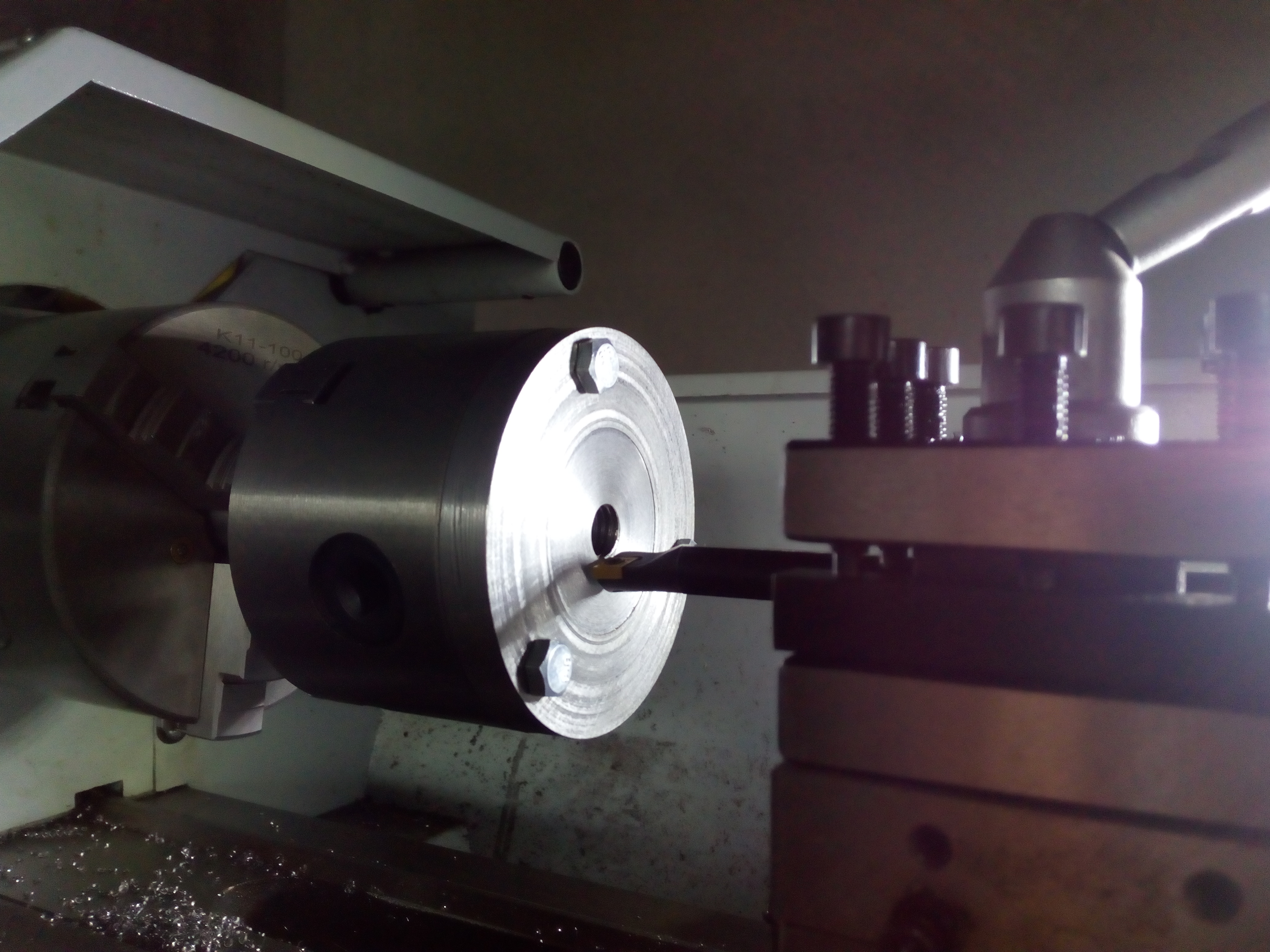 Вот в том то и дело что резец встает ниже оси, причем значительно. Поэтому и спрашиваю как правильно установить резец. Вообще мне надо получить отверстие примерно 13мм под резьбу М14х1. Сам резец может пройти в отверстие порядка 12мм без задевания стенки. Резец был в комплекте с остальными (набор из 5 резцов типа пара проходных, подрезной, резьбовой и расточной) с державкой на 10мм. Но ведь когда ставишь резец для наружной обточки у него верхняя кромка идет по оси заготовки, а не центр. А здесь получается должен центр находится на оси.