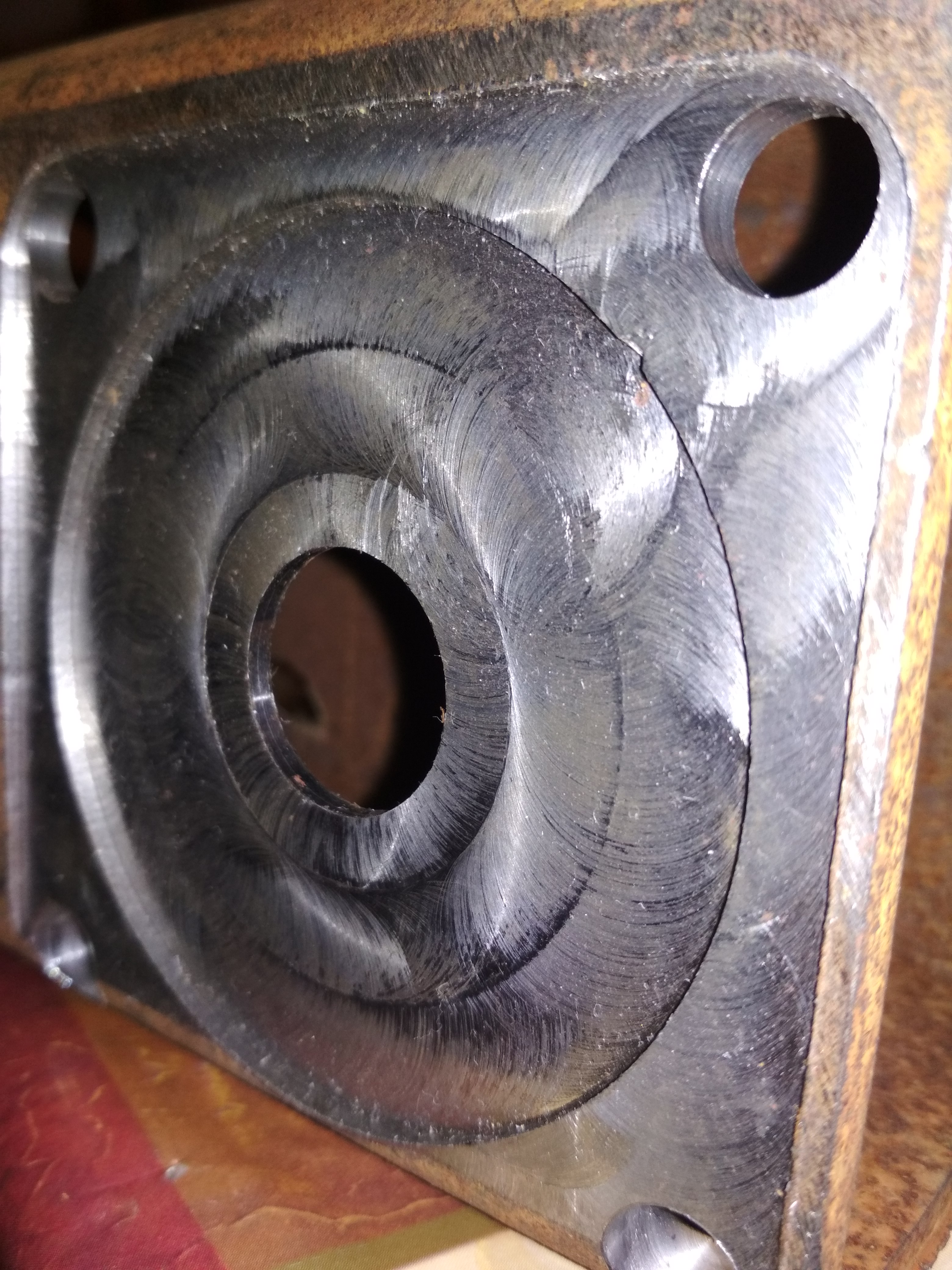 Нормальный след от фрезы. Просто большой съем на зуб и нет чистового прохода на меньшей скорости. Круговые следы при перпендикулярном шпинделе всегда остаются. Например при фрезеровке ГБЦ, чтобы от них избавиться, наклоняют немного шпиндель. При этом получается небольшая яма посередине (как правило очень небольшая в пределах 0,01), но зато поверхность красивая. Лично я плоскости ГБЦ шлифую и вот при шлифовке очень четко видны гребешки от предыдущей фрезеровки, хотя на ощупь все гладким кажется. Профилометром не богат, поэтому все на ощупь))