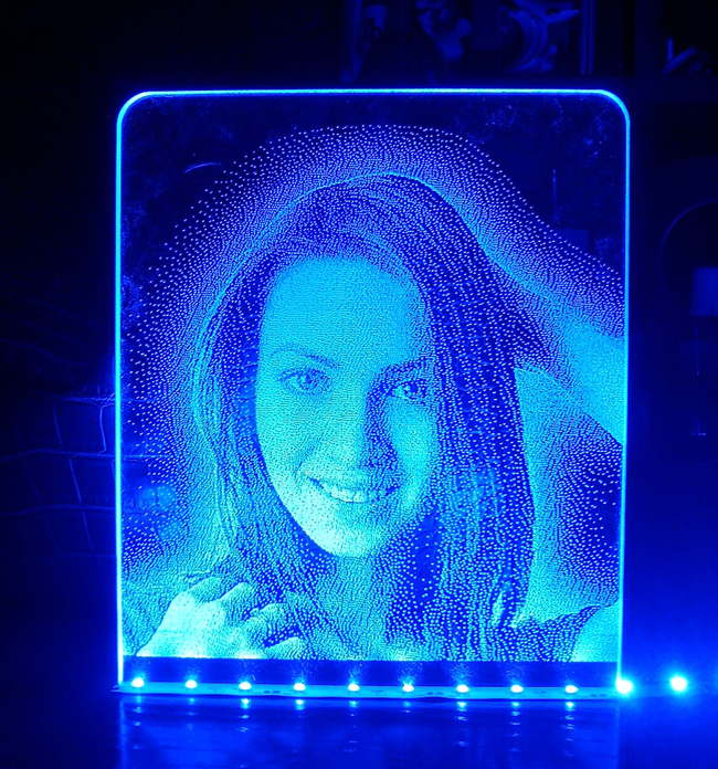 Метод ударный. Само фото "печаталось" немного меньше 4 часов, получилось 47202 точек -) Сам Г-код получился у меня на ~188 тыс. строк. До последнего сидел и смотрел на каждую точечку, сдувал каждую пылинку. Боялся, как бы опять не ломануло инструмент, ибо до этого метр оргстекла ушло в брак, а времени на отбраковку уже не было. Самое обидное, что в случае фиаско продолжать выполнение по G-коду нет смысла -- т.к. не удается точно закрепить инструмент в цанге на том же уровне, что и было до этого. В результате просто явно становится видно полосу, после которой значительно меняется яркость фото.