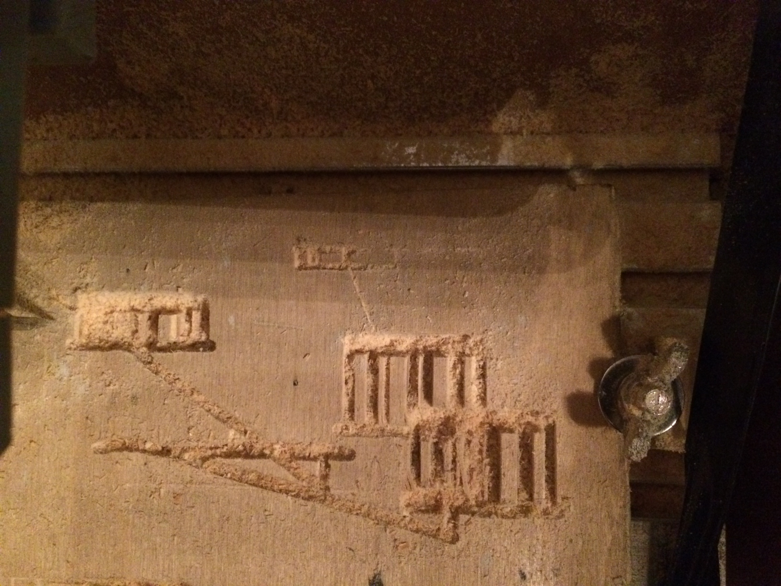 видны прорезанные на заготовке в беспорядке канавы вместо надписи "Artcam" из тестового файла и символа из моего файла.