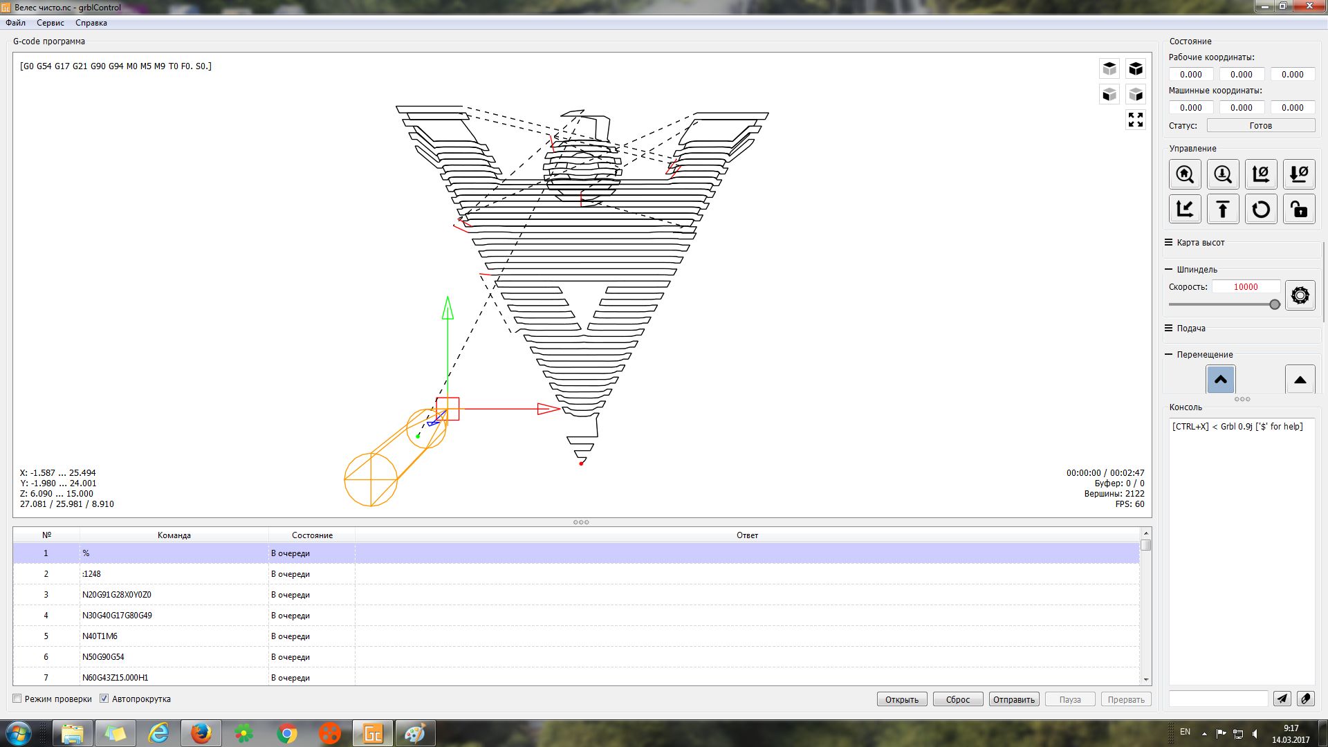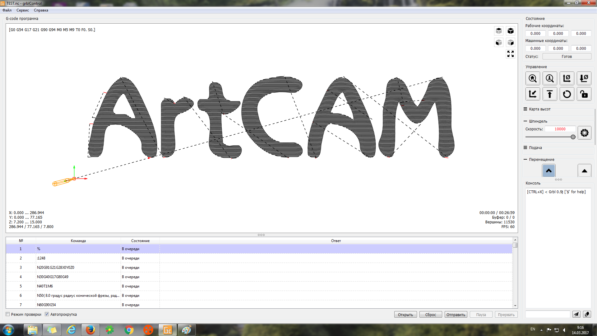 В Арткаме есть тестовый файл artcam.nc, сделал так же свой файл. Загружал их в программу управления станком - GRBL Control,