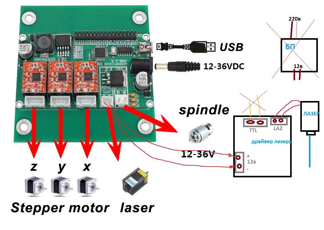 gever писал(а):Приветствую ! Прикупил cnc 2418 стали шаговые движки ,дремель и лазер работают ,проблема с питанием на движки ? БП то же работает !