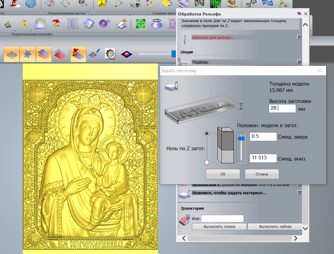 товарищи вопрос такой. создаю уп для резки панно. указал размеры, загрузил 3D модель. всё подошел у обработке рельефа.указываю фрезу. (сразу чистовой) толщину указал. начинаю считать траекторию а он вот че пишет : ошибка вычисления траектории проверьте параметры и данные. и отказывается считать траекторию обработки. подскажите что не так в чем ошибка. Спасибо.