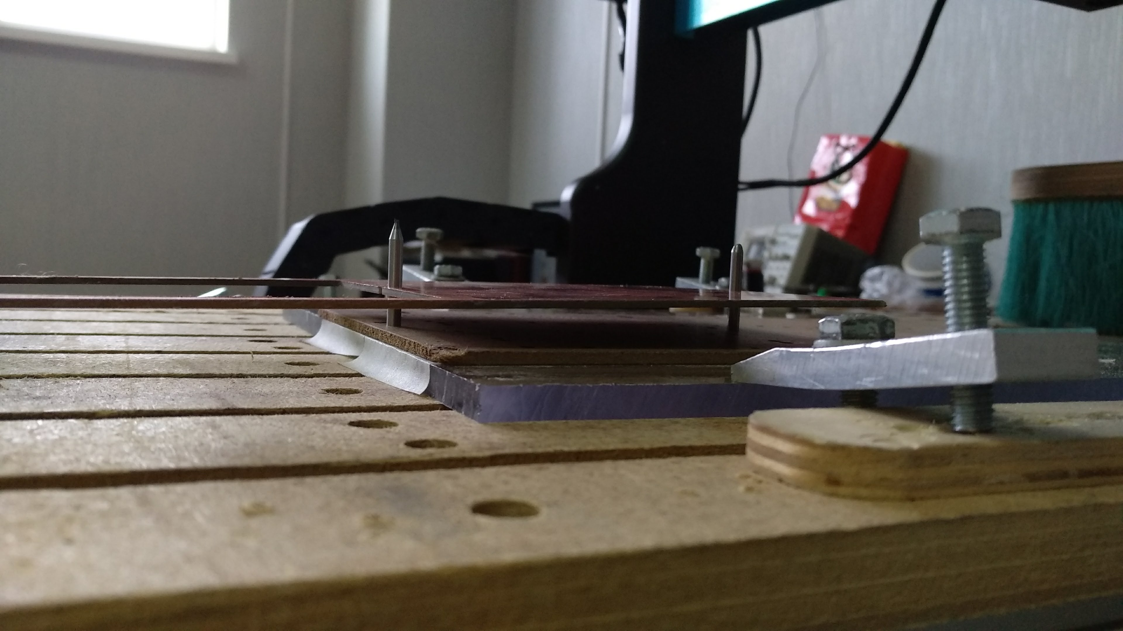 Так очень малыми усилиями получается очень высокая точность совмещения сторон, даже при некоторой небрежности. Только подложку нужно использовать жесткую и она тратится :) Я пока взял лист МДФ (по-моему), которым Резонит прокладывает присылаемые мне панели плат, судя по множественным дыркам самого разного калибра, у них он используется как подложка для сверловки :)