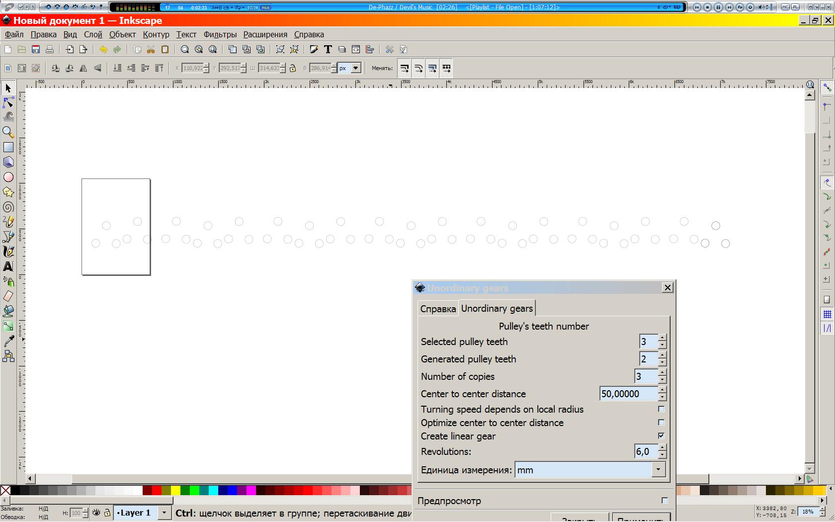 Ну как я уже писал, если рейка длинная, то лучше сначала сделать небольшой кусок, а потом, из него сделать рейку побольше. Иначе inkscape будет сильно тормозить, т.к. количество создаваемых контуров равно (к-во копий)*(к-во оборотов).