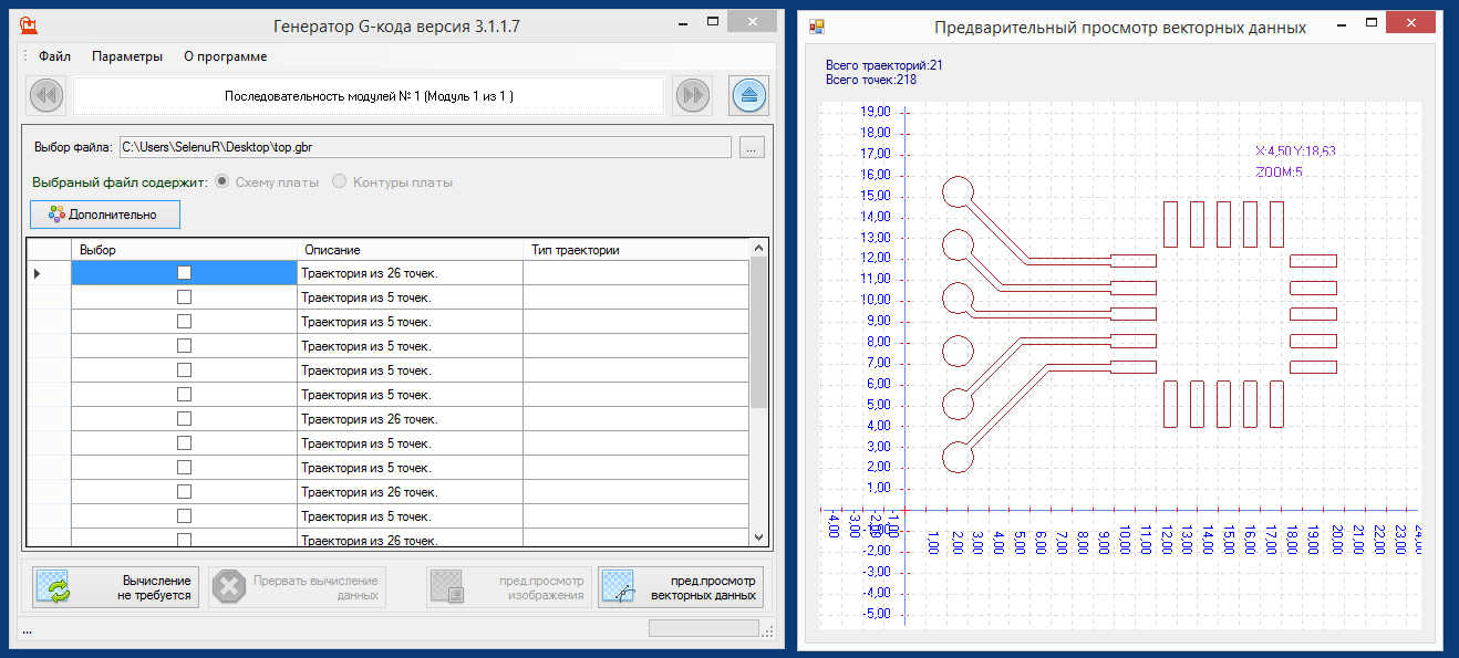 Сергей, спасибо огромное. G-код с отверстиями получаю без проблем. Вот только проблема у меня пока с Diptrace, придется наверное на 7 десятке лет осваивать ее. Скачал в соседней ветке разводку в дипрейсе и попробовал. Реально на фоторезисте попробую вероятнее всего завтра, а пока по перемещению лазера видно как делает окружность. Есть конечно небольшая просьба, там где колонка реверса как бы сделать выделение сразу нескольких траекторий, чтобы больше 100 раз не щелкать мышкой.