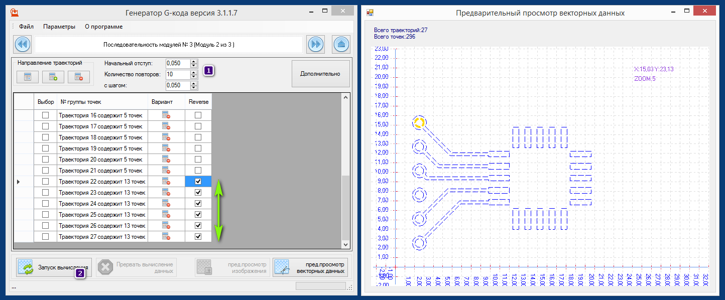 В нем нажимаем кнопку №1, и получаем все траектории из предыдущих модулей.