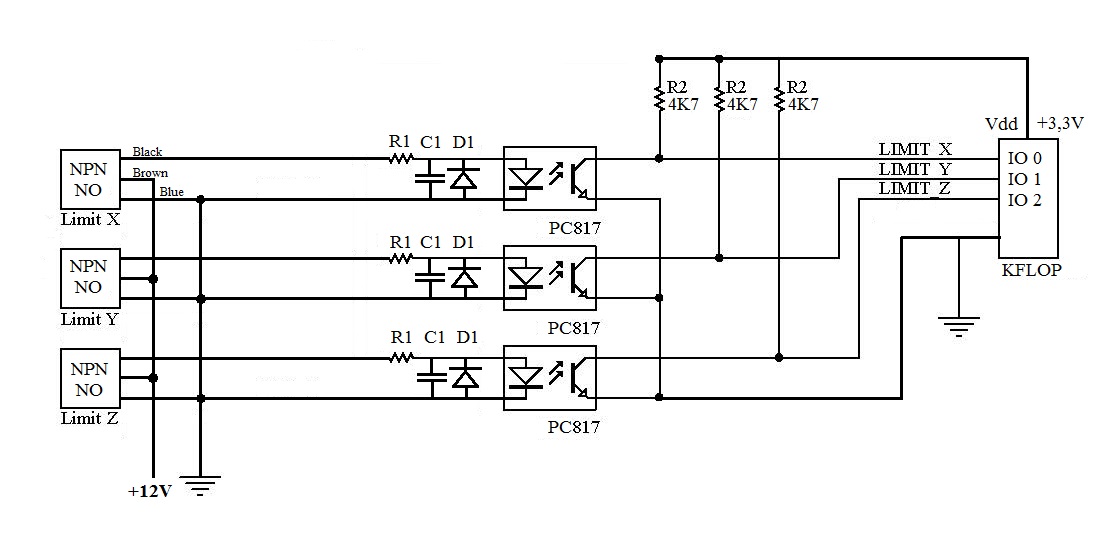 Такая схема, насколько я понимаю, хороша тем, что в случае обрыва проводов или пропадания питания датчика , KFLOP увидит срабатывание концевика и остановит движение.