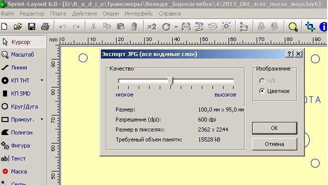 Сделал в Layot 6 лицевую панель к самопальному АМ приемнику. Размер морды примерно 10см 10см , сделал экспорт файла в *.bmp 600dpi.