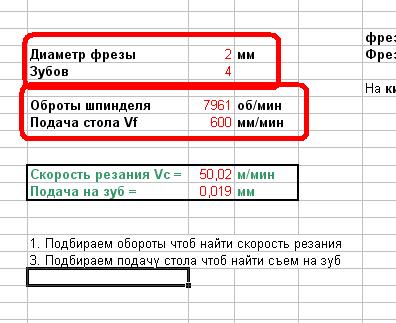 вот что показывает мой калькулятор режимов резания для фрезы 2мм
