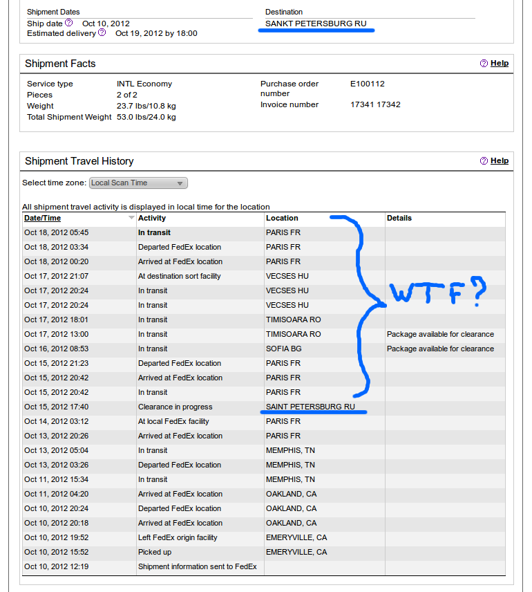 Это еще что, сейчас как раз большое количество плат Mesa летит, причем Fedex-ом, причем вторая коробка уже лежит на таможне, причем звонил им, говорят, да, так все и есть, груз прилетел, а потом улетел :idiot: :