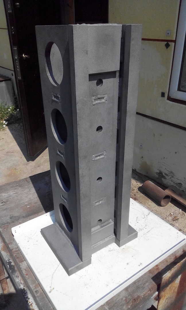 Новая колонна, порезана из металла 16мм, внутри 3 переборки, которые заодно служили кондуктором для сборки изделия перед сваркой. Сварено, отожжено, отпескоструено, грунтовано. Дальше фрезеровка лица и зада, потом шлифовка, а потом самое интересное, фрезеровка под рельсы...