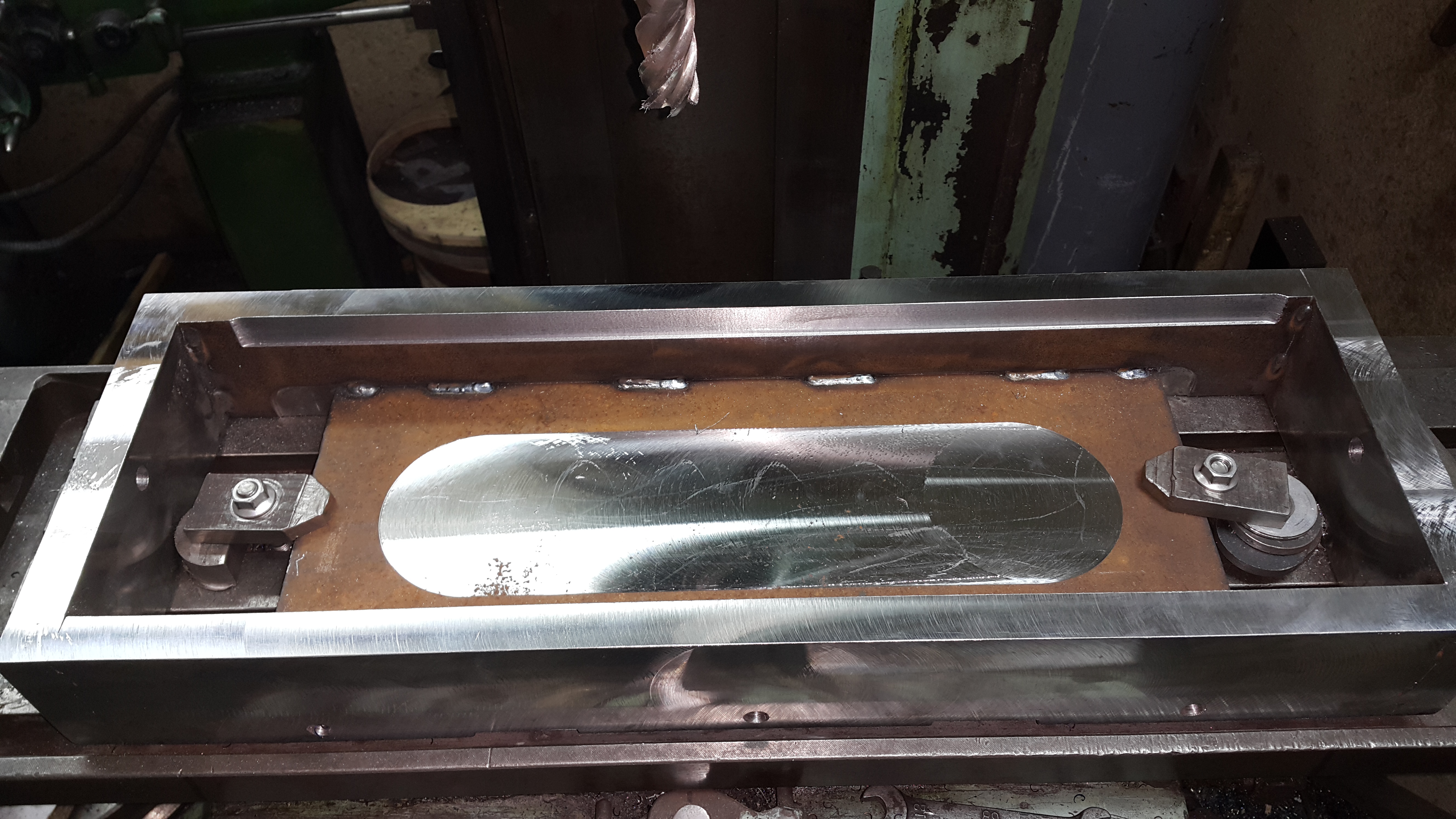 Сегодня доделал пластины чтоб закрыть контур, отфрезеровал базовую плоскость снизу и сбоку. Пока игрался на основном фрезере начал подкусывать винт продольной подачи. Пришлось разбирать, пол дня убил оказалось стружка залетела в паз винта там где шпонка ходит вращающая его и из него попала в гайку. Вот и заклинило, Ума не приложу как она могла туда попасть. В итоге все собрал и успел даже забазировать деталь.