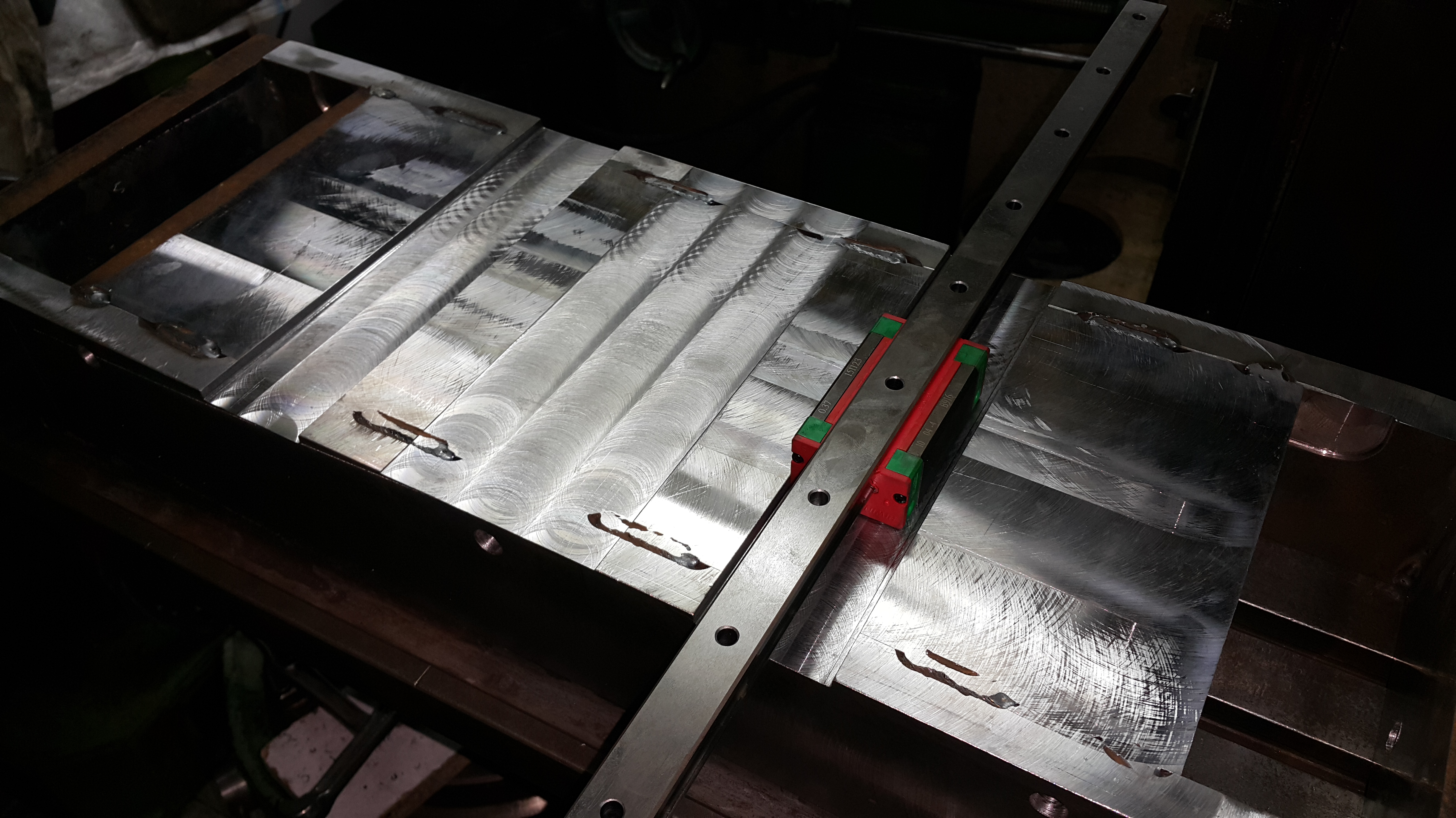 Потом перестроил станок с голизонталки в вертикалку и фрезеровал посадки под рельсы. Куча выставлений куча перестановок так как ход стола станка всего 550х160 а деталь длиной 640. Но вроди все получилось, на длине 600 укладывается в сотку. Думаю после всех работ отвести на шлифовку еще. Для пущей точности. Теперь надо насверлить отверстий и нарезать кучу резьб. И тогда уже продолжать с основанием а затем с изготовлением крепежа под опоры, гайки и двигателя.