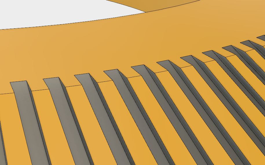 Достаточно нарисовать 3 прямоугольника разной длины, один в другом. Потом вытянуть из них разные 3Д кирпичики. Эти кирпичики повернуть по высоте на тот же угол, что и у наклонной поверхности. Немного опустить их вниз и создавать из них нужные круговые массивы. Затем из основной фигуры вырезать все эти тела.