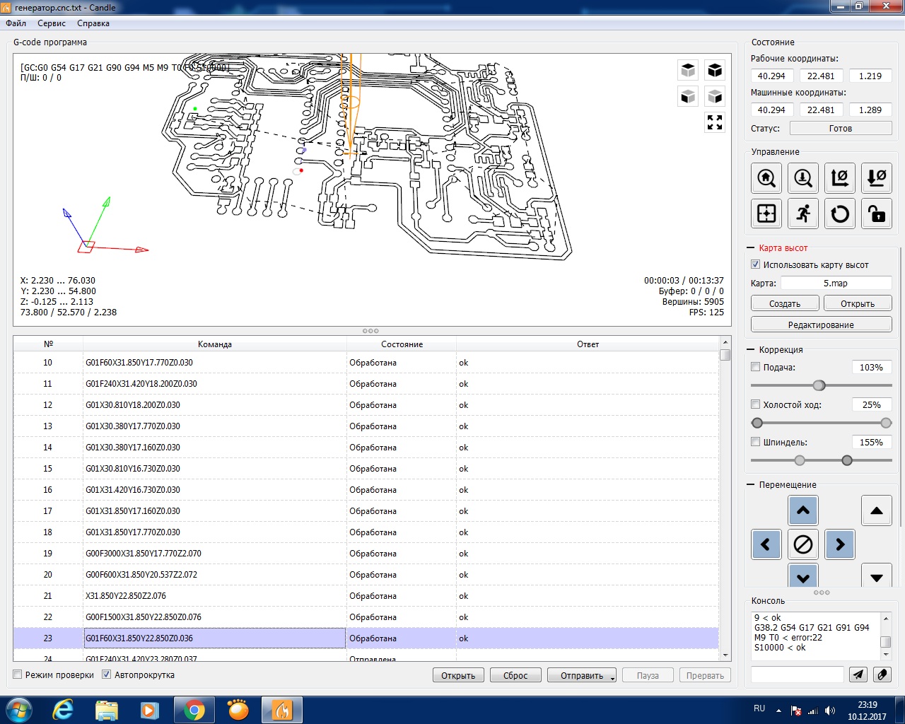 А именно: после снятия карты высот на текстолите неверно определяет точку начала работы, уводит шпиндель в совсем другое место либо тупо вгоняет в материал и ломает гравер :cry: ,использую для управления программу CANDLE 1.1.7.патрон стоит ER11. В начале работы пишет ошибки( error20, error 21) :thinking: . Иногда после 1,5-2 часов может зависнуть.