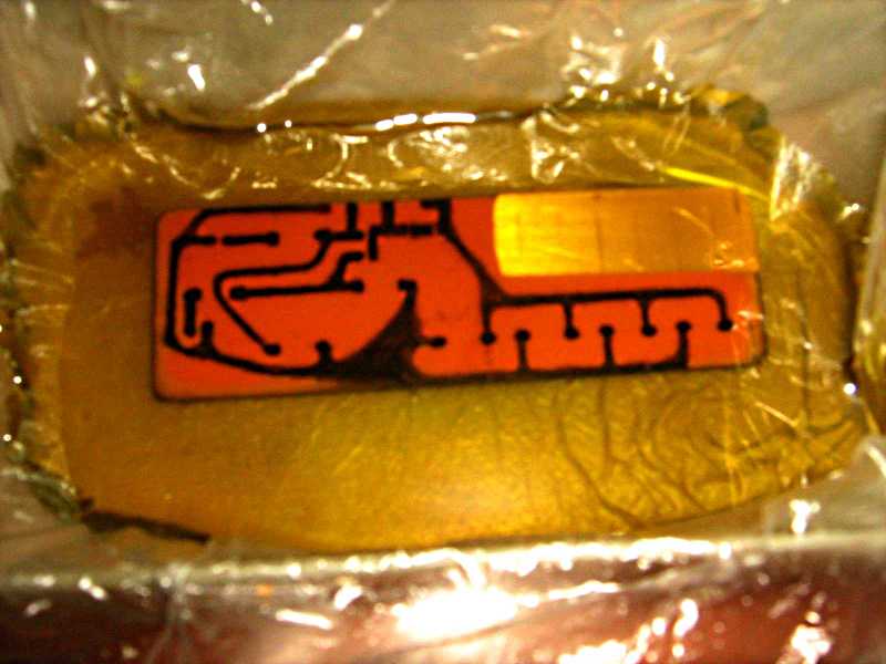 Быстренько нарисовал и опустил в хлорное железо. Вот плата в процессе травления: