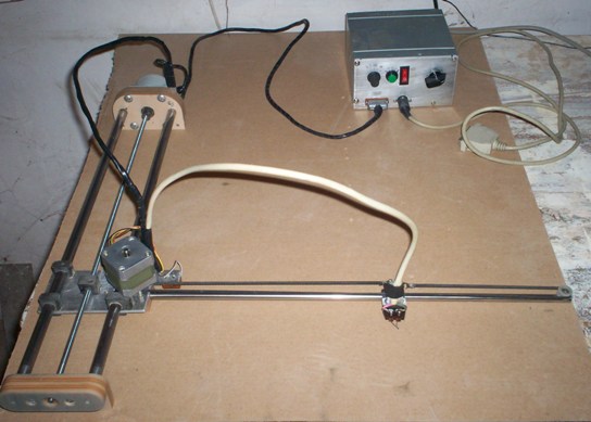 Вот немного фото для представления. Блок питания компьютерный. 5 вольт питает съему, 3.3 на нихром. Шаговики от старых принтеров. Направляющие 8-10мм стоят копейки. Arduino, два драйвера a4988, два движка Nema 17 весь бюджет. Ну и напильником как следует поработать