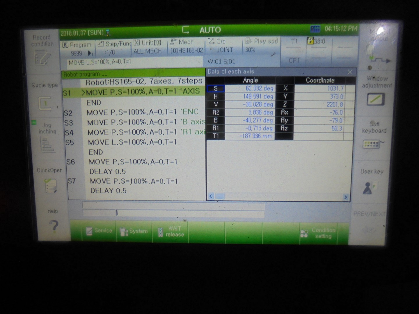 :attention: Чтобы робот шевелился нужно эту кнопку удерживать в среднем положении. Нажимаете, слышите как в ящике щелкает пускатель, потом через пару сек. щелкают тормоза в сервах и можно крутить роботом. Это наверно сделано для безопасности, если пульт уронили или руку придавило - робот не будет работать :roll: