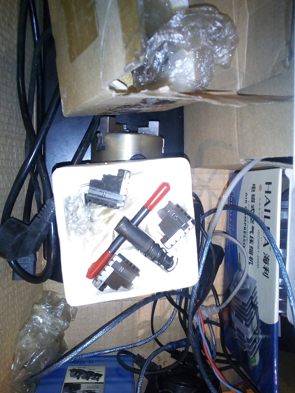 В комплекте со станком идет куча барахла - небольшой компрессор (аквариумный), помпа для ОЖ, вытяжка-улитка китайская какая-то, 4 ось, два диска с ПО и даже флешка и обратные кулачки к токарному патрону))