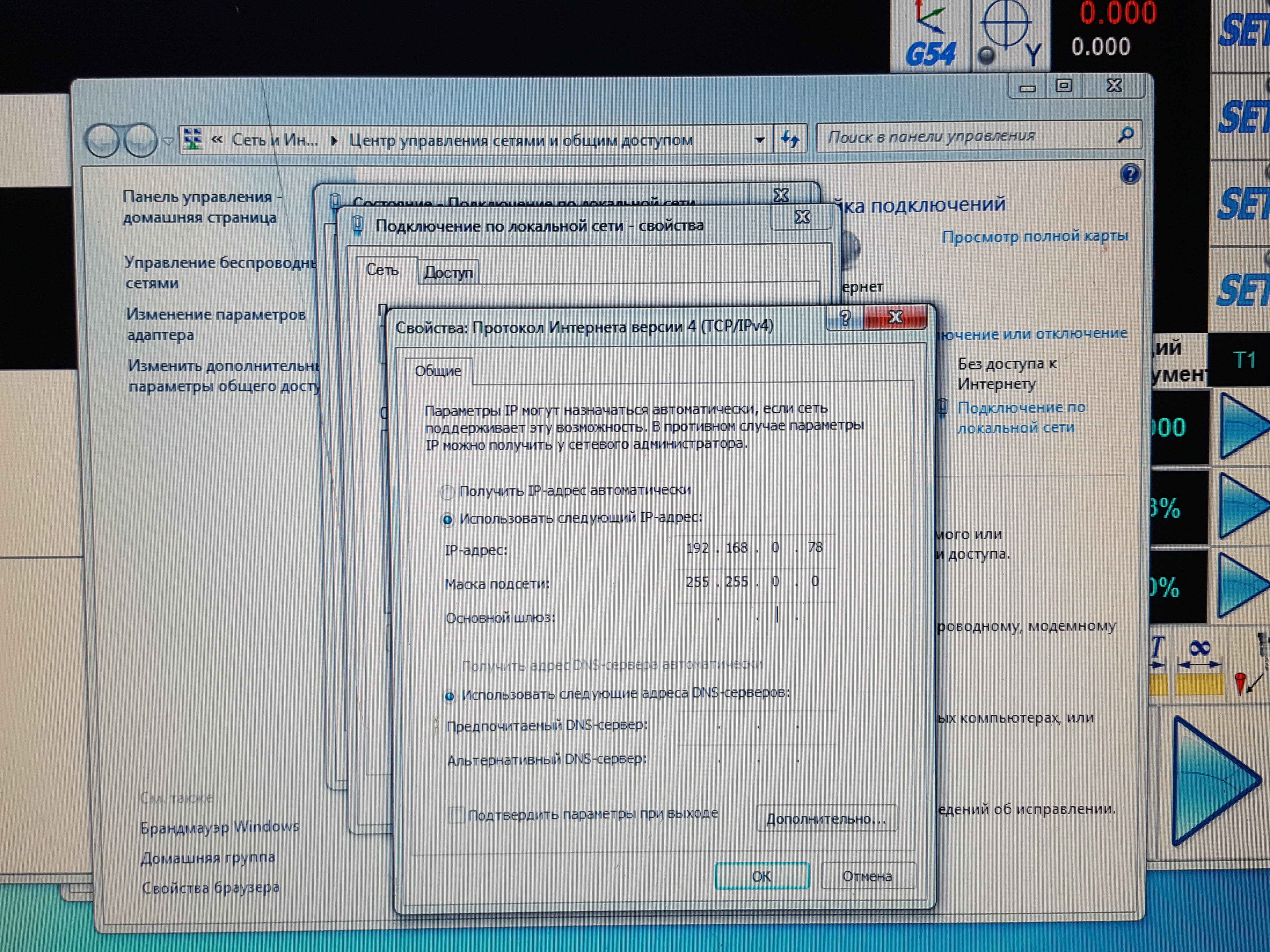 У вас "путаница" в понимании работы компьютерной сети. Если простейший вариант компьютер и myCNC контроллер в одной сети и больше нет других устройств, то что-то типа такого: у контроллера адрес по умолчанию 192.168.0.78 - значит у компьютера не может быть такого же адреса, выбирайте, например 192.168.0.70 и маску подсети 255.255.255.0.