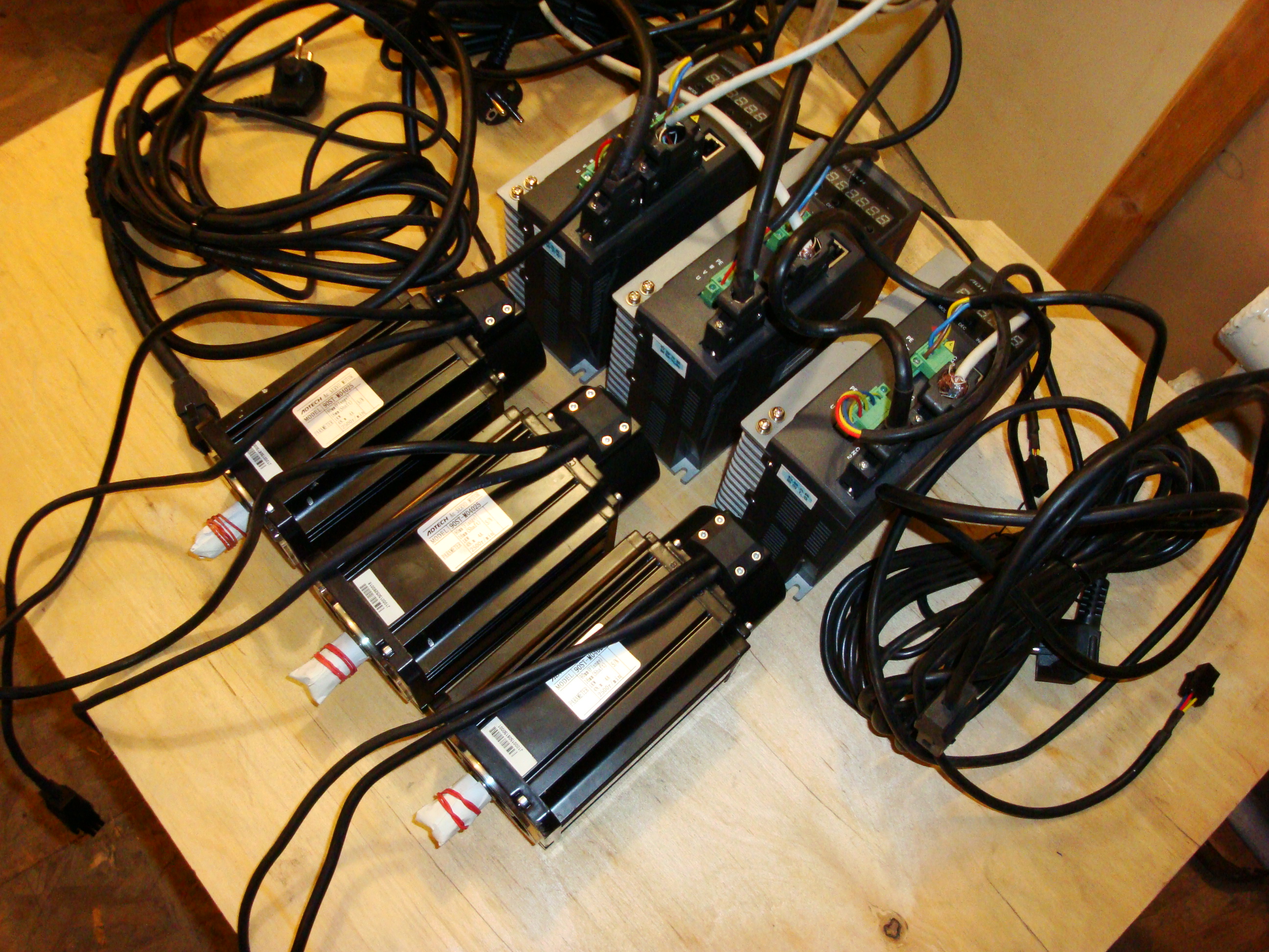 С рабочего станка. Набор на три оси. Три усилителя, три мотора, кабели. Мануалы есть в сети, могу выслать на почту. По договоренности можно продать вместе с обвязкой (реле, автоматы, пускатели) и шкафом. приложил фото. Но шкаф ОЧЕНЬ тяжелый и габаритный. Цена за комплект из трех сервоприводов 100тыс. продано