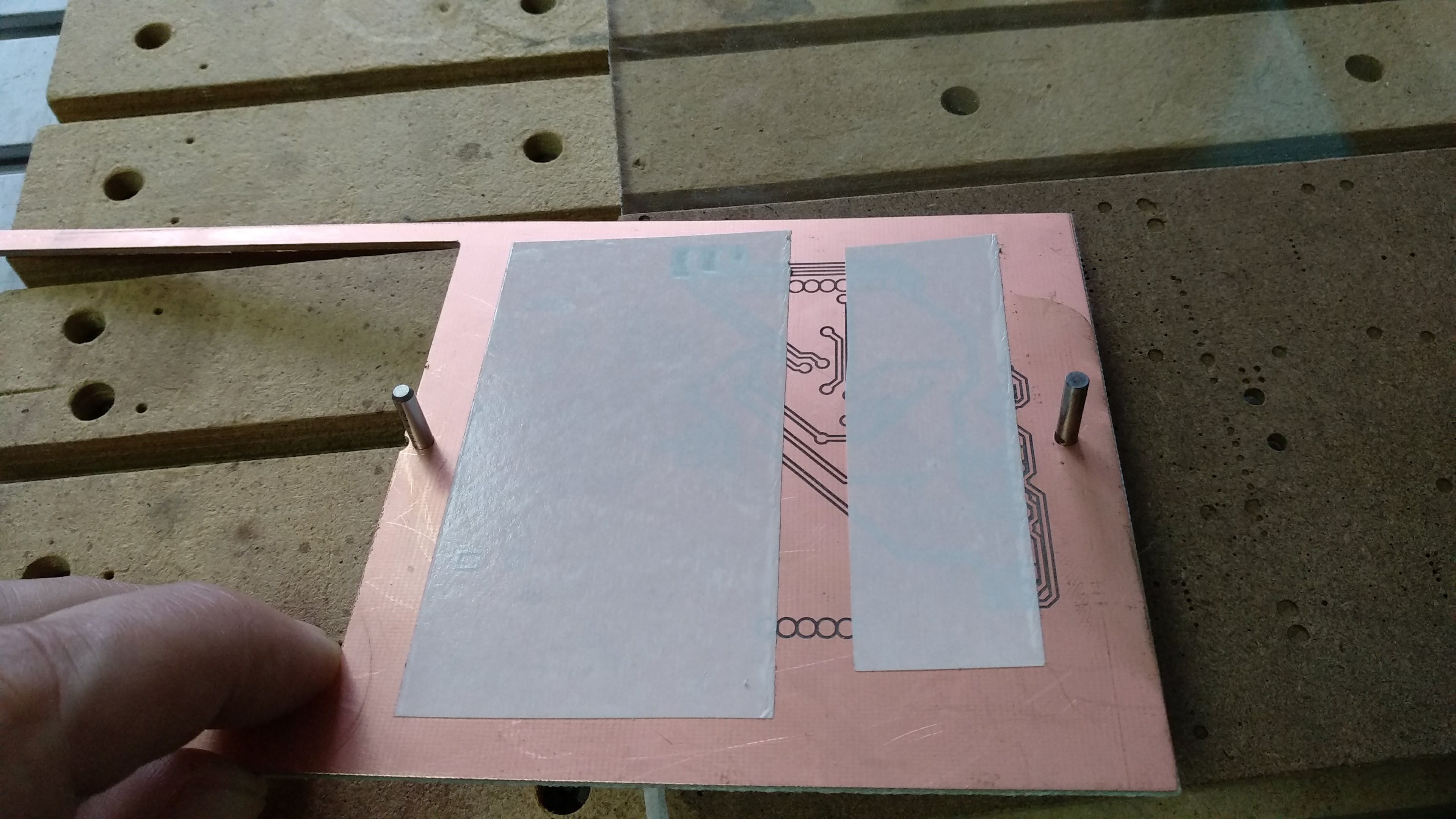 Так очень малыми усилиями получается очень высокая точность совмещения сторон, даже при некоторой небрежности. Только подложку нужно использовать жесткую и она тратится :) Я пока взял лист МДФ (по-моему), которым Резонит прокладывает присылаемые мне панели плат, судя по множественным дыркам самого разного калибра, у них он используется как подложка для сверловки :)