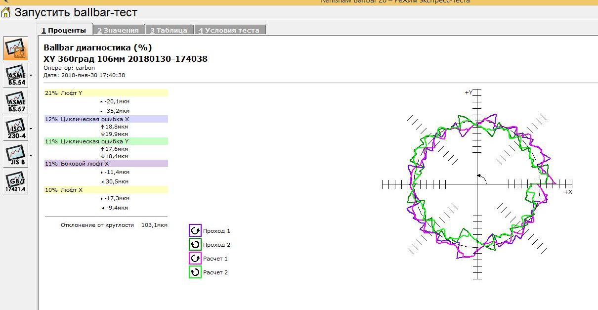 Да там программа работает как-то любопытно, пока об этом не задумывался.aftaev писал(а):У BallBar программа хитро работает. Задается измерительная окружность, например ф150мм. Программа генерит Gcode. В Gcode есть отводик на 151мм. Запускается софт балбара и он ждет пока щуп не сдвинется на 1мм (150мм). Как только программа это обнаружила, стартует считывание данных с датчика. А так как софт "писал" Gcode для станка, то знает с какой скоростью двигается станок и с какой скоростью опрашивать датчик и рисовать график.