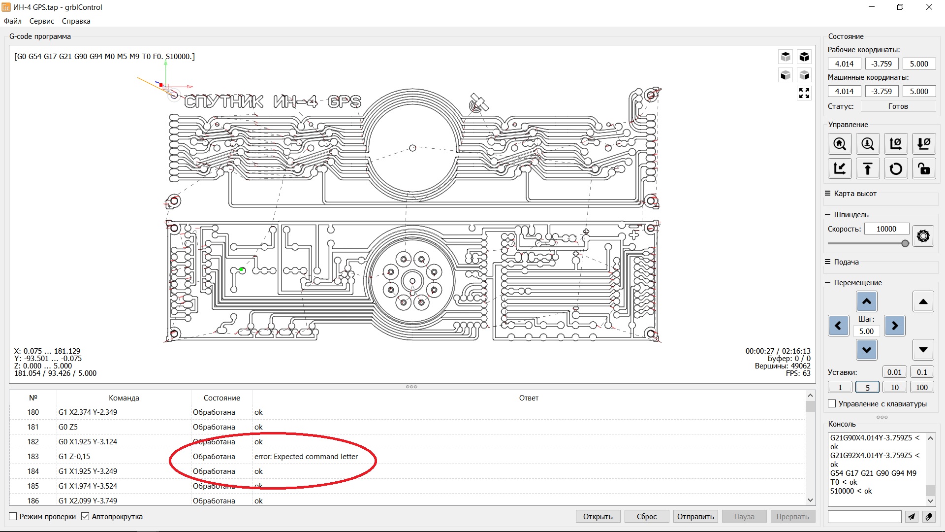 Дано - необходимо сделать 2 платы экспортирую файл в .plt в степкаме преобразую в G-код открываю в grblcontrol, выставляю "0" отправляю в работу - фреза летает в 5мм над текстолитом и вот такая надпись. программы сносил, грбл сбрасывал в заводские. а примеры с диска станка работают норм. что за фигня? ткните носом. разрыв мозга