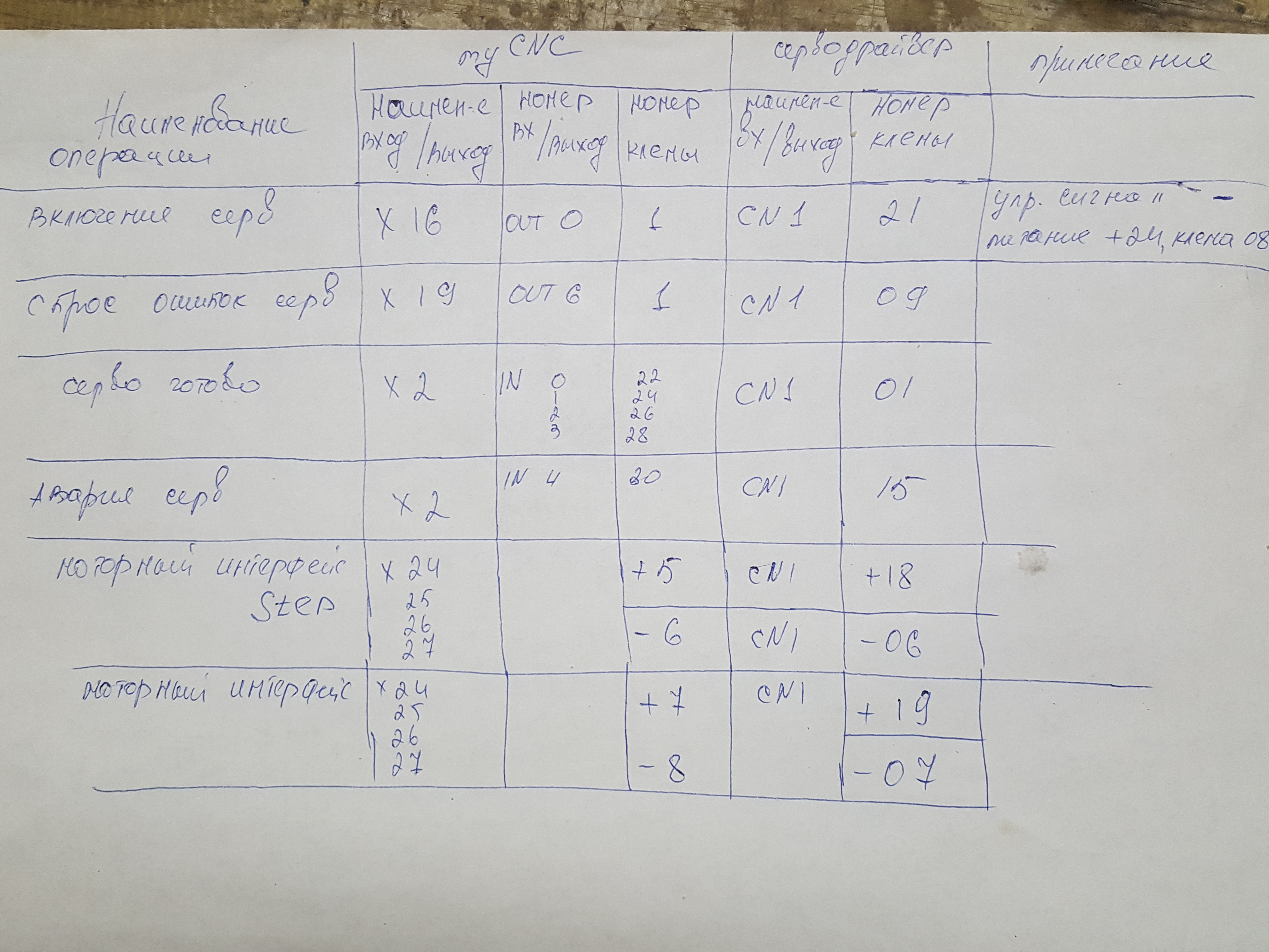По рекомендации niksooon, составил таблицу подключения серводрайвера к контроллеру. Осталось за малым - пропаять. Моторный интерфейс уже подключил.