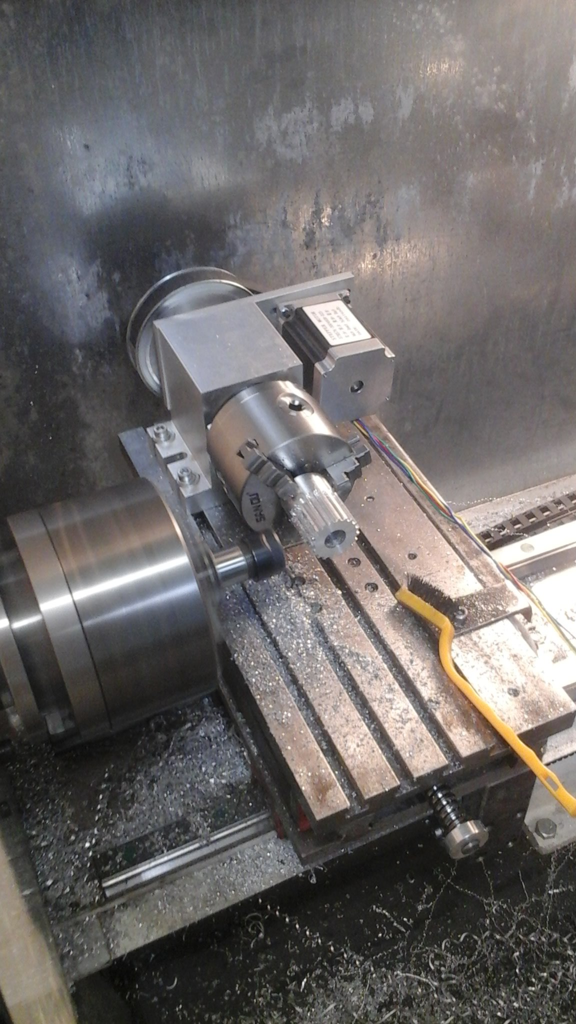 Сегодня поставил поворотную ось, выточил заготовку, выставил. Начал фрезеровать твердосплавной радиусной фрезой ф3мм, которую довольно быстро сломал, она уже очень уставшая была. Заточил хвостовик сверла ф3мм, зажал, потихонечку прорезал. Ремень облегает нормально, но чтобы легко ложился в канавки, придется сгладить их кромки радиусной фрезой миллиметров 6 в диаметре примерно.