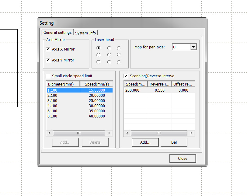 Тогда см. картинку - в системных настройках RDWorks поставить галочку "Scanning" и добавить в таблицу свою скорость гравировки и параметр "Revers interval" - подбирается
