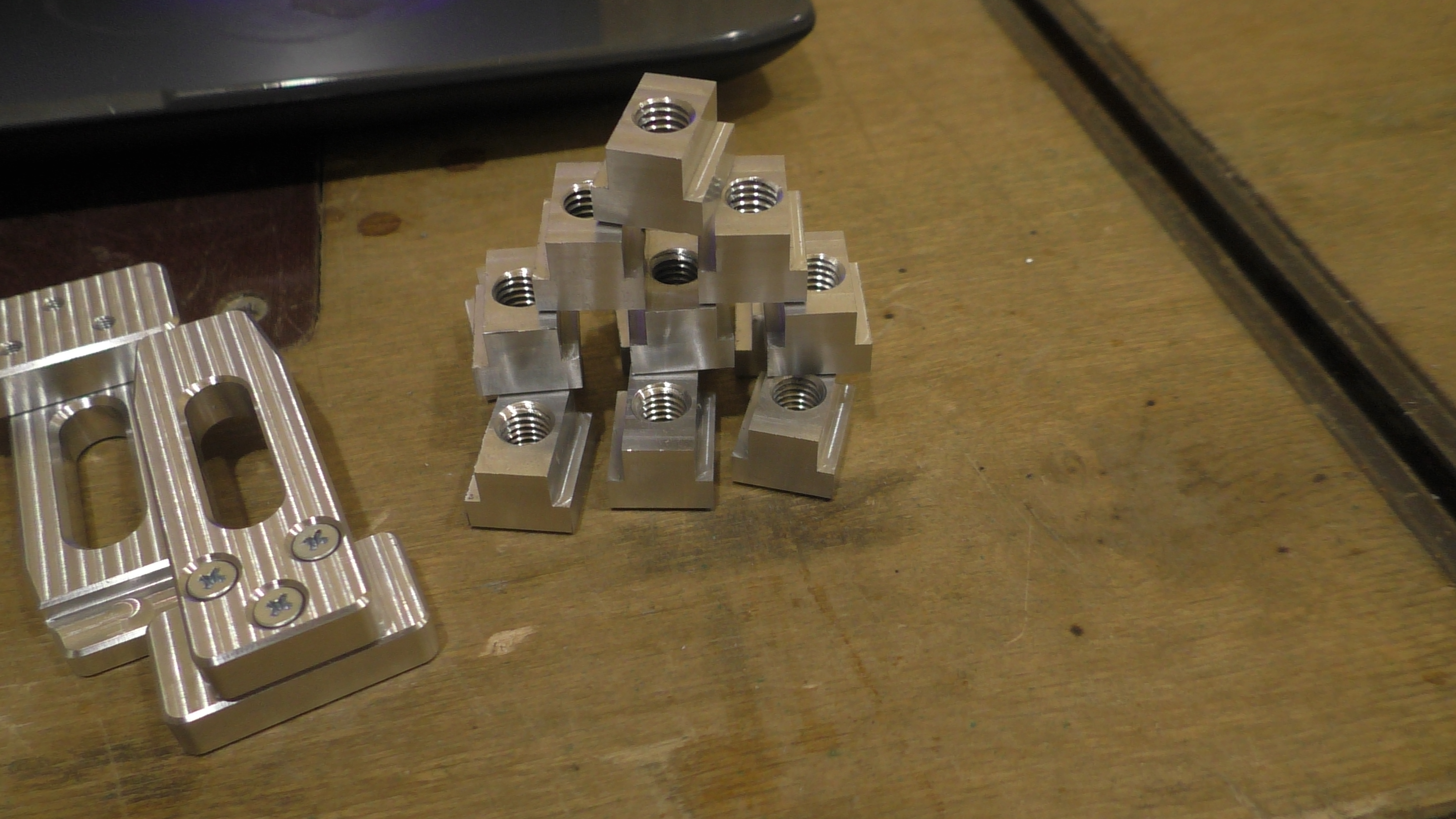 В порядке ознакомления со станком, а так же в целях получения практики запилил себе вот такие прижимчики для тисков с Т-гайками: