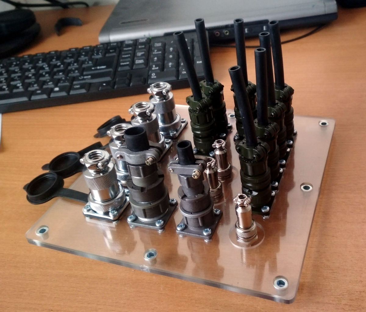 Если за военные разъемы я еще уверен, то вот за блестящие "китайские?" сомневаюсь. подключите провода и прозвоните их при этом пытаясь согнуть разогнуть провода. иногда бывает такое что пропадает контакт. а этого не любят драйвера и др оборудование