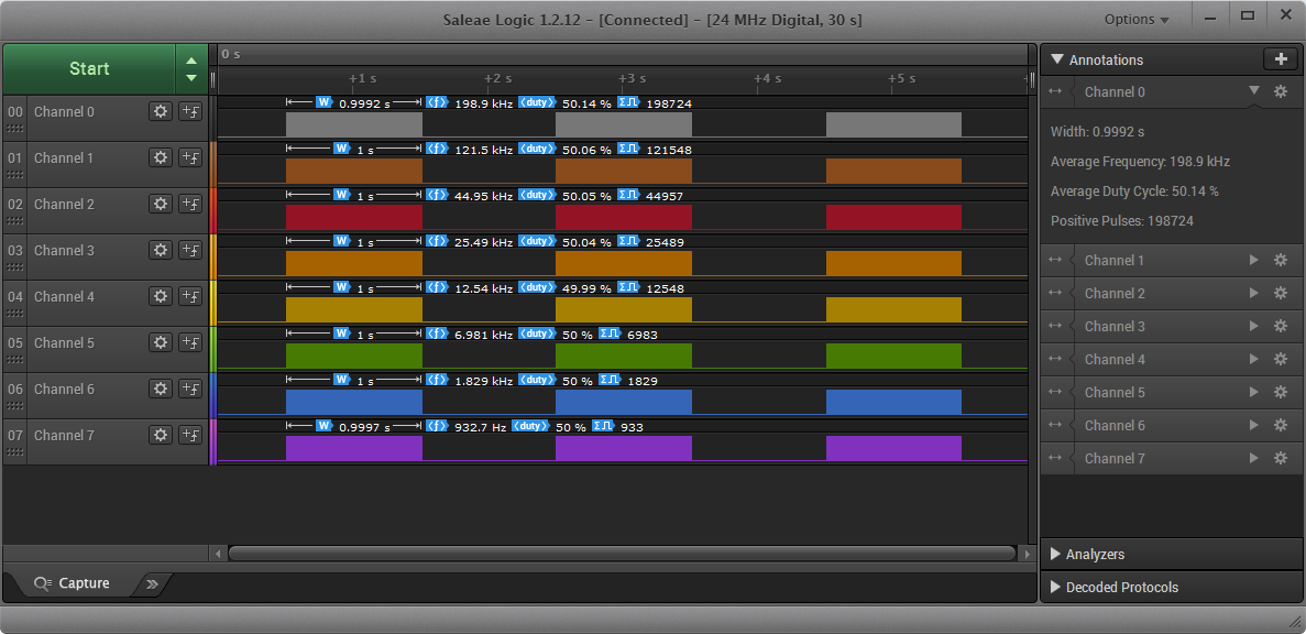 Чтобы проследить точность генератора взгляните на осциллограммы и сравните их с заданиями для каждого канала: