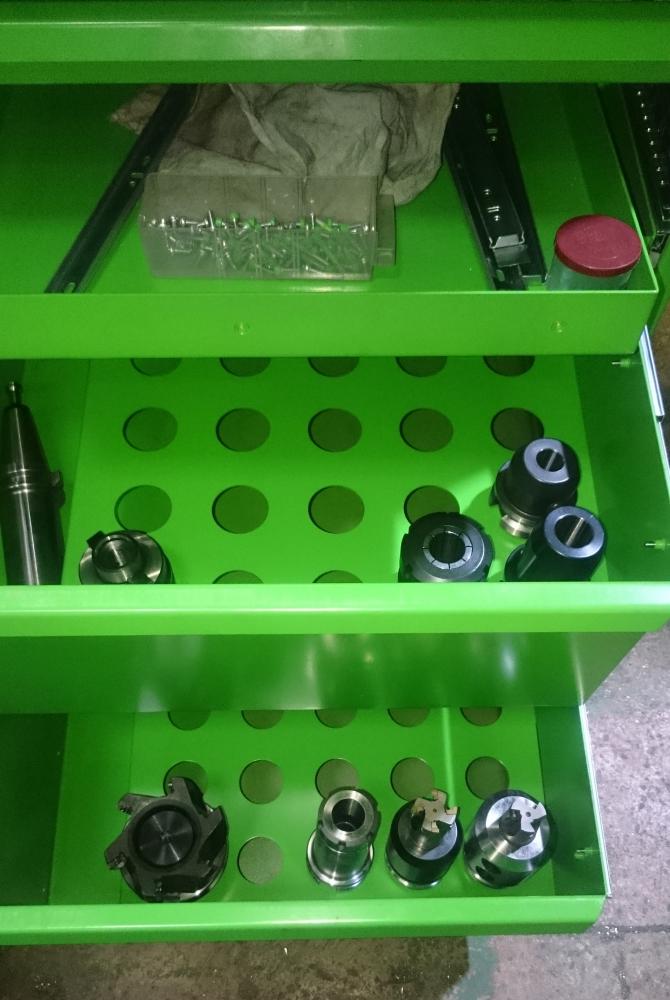 порезанный и погнутый металл - сам шкаф: ящики: вкладыши под фрезерную оснастку ИСО-40 (BT, SK)... сборка ящика... верхняя крышка сделана лотком, чтобы ничего не падало.. отбортовка высотой 15мм... готовый, покрашенный шкафчик: ну и в начале наполнения... Собственно это был первый вариант. он был полностью переработан, в плане технологичности сборки (уменьшение возможностей накосячить), уменьшения металлоемкости (как следствие цены), доработаны и убраны всякие мелкие косячки - на этом ящике предняя панель самого ящика не закрывает направляющие - просто не аккуратно выглядит по сравнению с токарным.. и не учел что направляющие реально отличаются от заявленных размеров в большую сторону - как следствие передние торцы торчат на 1-1.5 мм.. новый ящик сделал уже с ушами, прикрывающими направляйки и увеличил в глубину так чтобы эти самые направляйки не торчали...