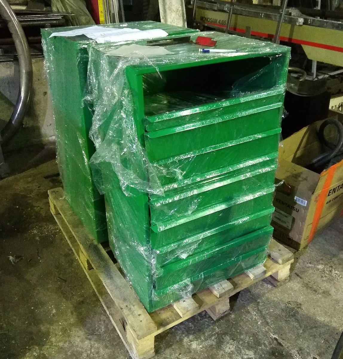 Собственно это был первый вариант. он был полностью переработан, в плане технологичности сборки (уменьшение возможностей накосячить), уменьшения металлоемкости (как следствие цены), доработаны и убраны всякие мелкие косячки - на этом ящике предняя панель самого ящика не закрывает направляющие - просто не аккуратно выглядит по сравнению с токарным.. и не учел что направляющие реально отличаются от заявленных размеров в большую сторону - как следствие передние торцы торчат на 1-1.5 мм.. новый ящик сделал уже с ушами, прикрывающими направляйки и увеличил в глубину так чтобы эти самые направляйки не торчали...