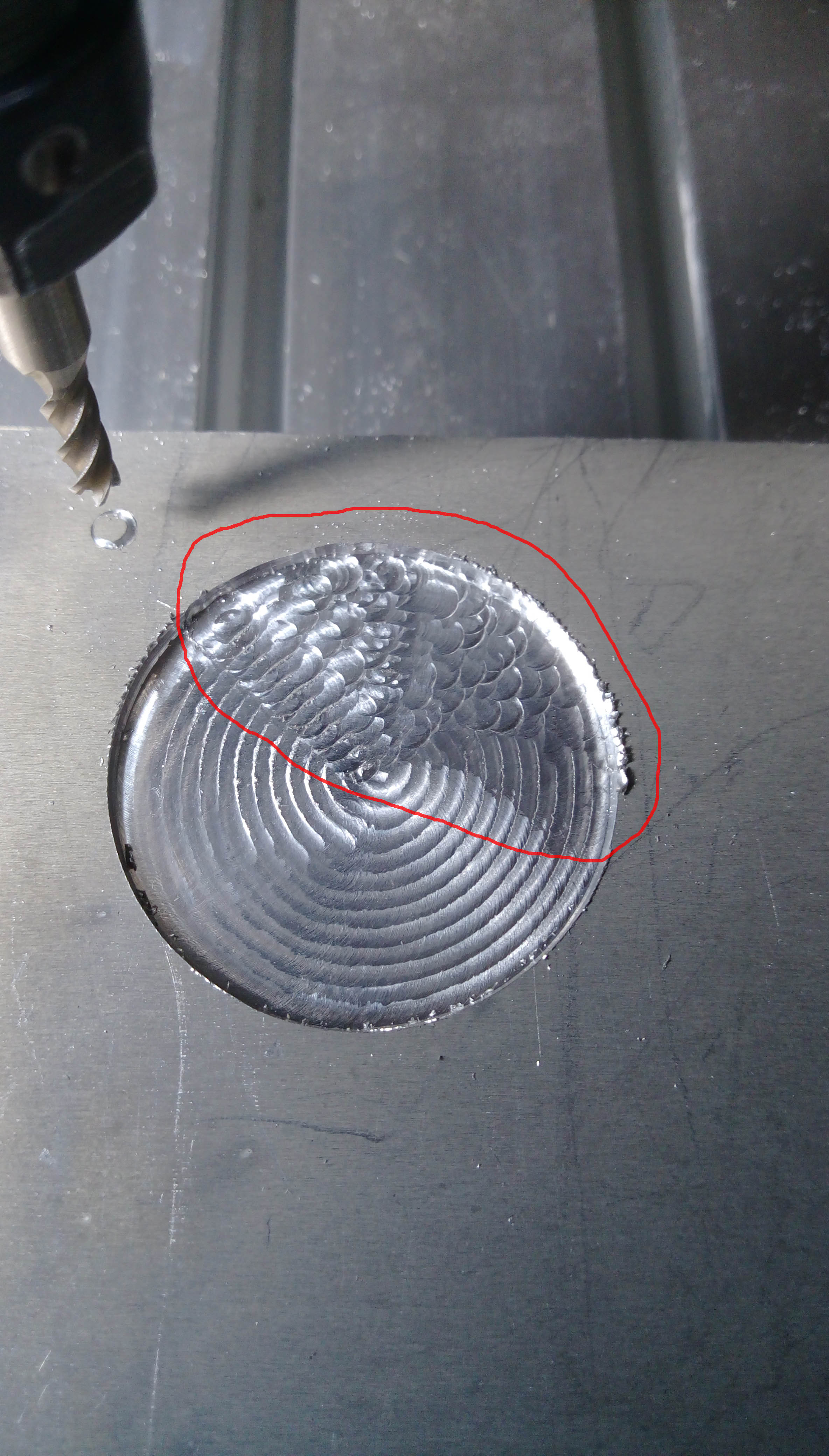 Вчера делал фрезеровку окружности (материал Д16АТ , глубина 1,5 мм, снятие за проход 0.25 мм, подача 1,5 мм/сек, СОЖ нет, фреза пока 4 мм диаметр - китайская, четырехзаходная, типа по алюминию, жду одно- и двухзаходные). В итоге на обработанной поверхности на части окружности наблюдается странный узор (обведено красным).
