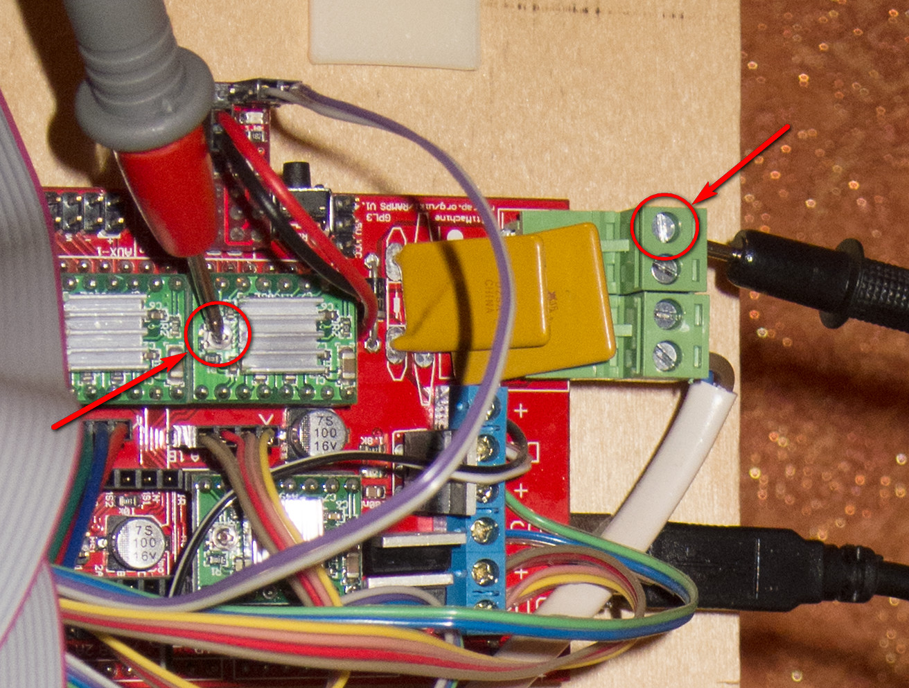 Минусовой щуп мультиметра подсоединяем к контакту GND (минус, он общий), плюсовым прикасаемся к корпусу подстроечного резистора на драйвере. Крутим подстроечный резистор отвёрткой и замеряем расчётное напряжение Vref. Таким образом мы выставляем правильный ток для драйвера шагового двигателя. Для каждого вида драйвера своя формула расчета Vref.