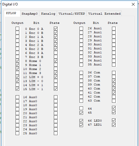 Здравствуйте! Какая-то непонятная проблема выявилась в системе Kanalog+Kflop: не могу сделать обнуление по энкодерам через JP2, хотя в файле обнуления осей объявляется SetDirectionBit(36,0) и SetDirectionBit(37,0). Если ноль метки перенести на незадействованные у меня виртуальные биты 6 и 7 (разъем JP1), то обнуление происходит адекватно. Помогите пожалуйста! Версия Kmotion 4.34j