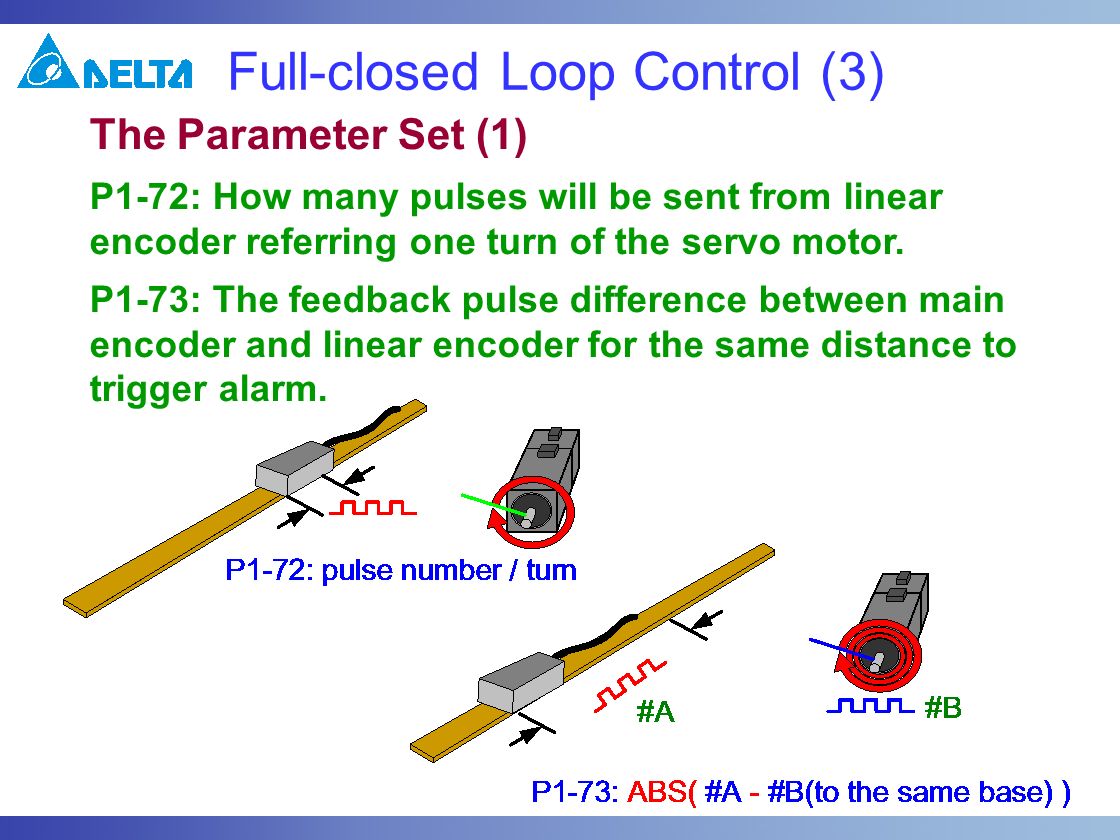Собственно в чём проблема: при включении Full clossed loop в Дельте надо изменить всего два параметра - P1-72 и P1-74. P1-74 - это собственно вкл или выкл, а вот в P1-72 указывается количество импульсов, которое выдаёт внешний энкодер/линейка на один оборот сервомотора, причём это число должно быть целым и больше 200.
