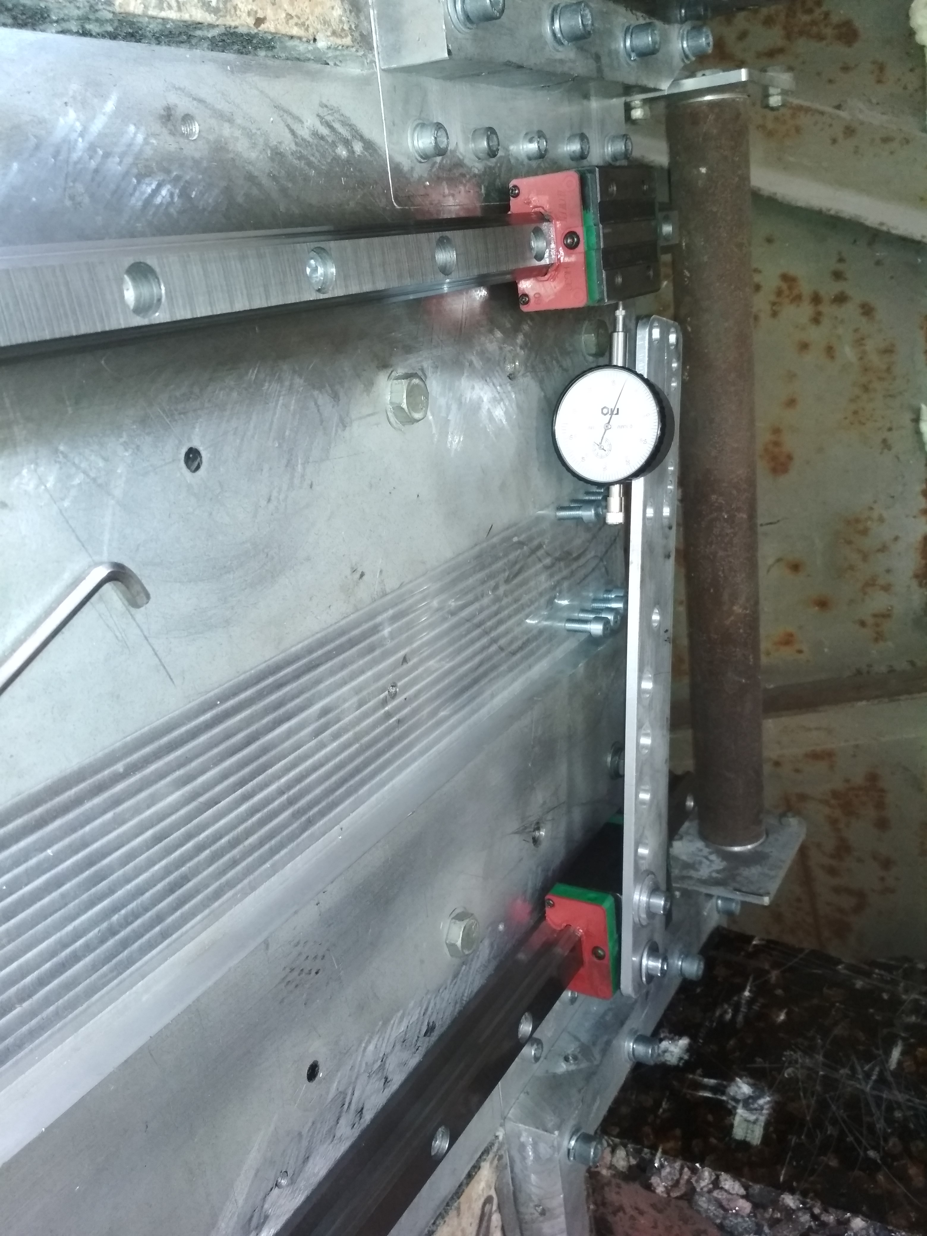 Ситуевина со станиной не столь радужная получилась как предпологалось. Зимой в минус 15 основание станины шабрилось под рельсы. Было все вышабрено в ноль но рельсы не выставлены. Вчера на улице было +15 и я решил думаю проверить, как дела перед тем как рельсу положить и очень расстроился поскольку станину выгнуло аж на 0.03 пузырем в середине. То есть на каждые 10 градусов изменения температуры станину выпучивает на 0.01мм. Это конечно сильно опечалило, и рельсы были положены так как есть ибо при снижении температуры все выгнется обратно и смысла опять шабрить в 0 нет, итак было убито около недели на все это или может больше уже не помню.