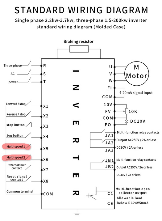 Евжений писал(а):Интересно а как вообще это должно происходить? В пульте восемь скоростей. В настройках пульта привязки скоростей к оборотам в минуту нет. Каждой скорости (из восьми) соответствует определённая комбинация трёх выходов. А вот уже частотник знает какой комбинации этих выходов пульта какая частота соответствует. Возможно в уп надо ещё что-то писать, например номер скорости (тех что восемь). Не видел ни разу такой работающей замуты. Всегда в пульте скорость заранее ставится или крутилкой на частотнике.