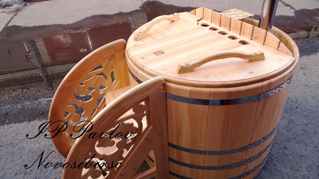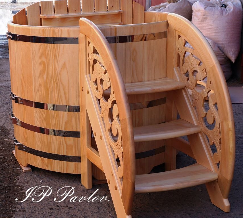 Тут еще видео выше выкладывал про японскую купель офуро с печкой на дровах. Вот, стащил фотки. Я на этой купели делал декоративную вставку на трапе, ну и по-мелочи шаблоны.