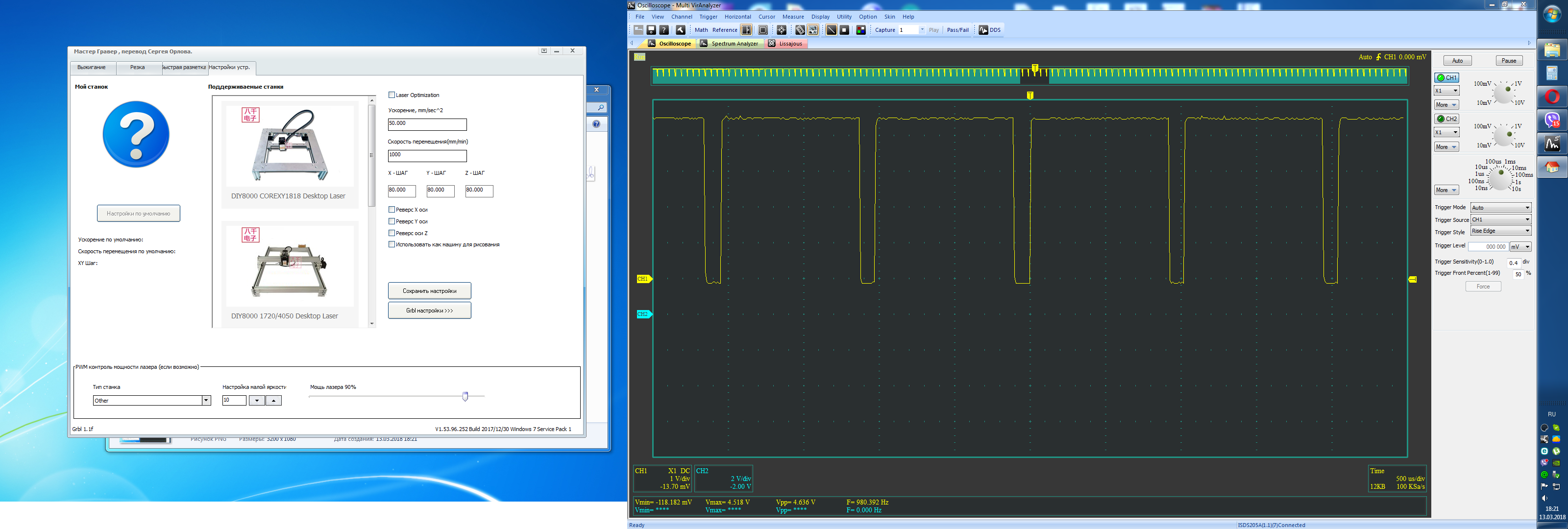 Доброго времени всем! У меня UNO и GRBL 1.1. Суть вот в чем сегодня посмотрел осцилом что происходит на выходе регулировки лазера с ардуино. Выходит там именно ШИМ (PWM) так как частота не меняется а меняется ширина импульсов.Nixon писал(а):(В самом примитивном изложении. Остальное, как говориться, в Википедии)DOKTOR_666 писал(а):Объясните пожалуйста тогда , как правильно ??