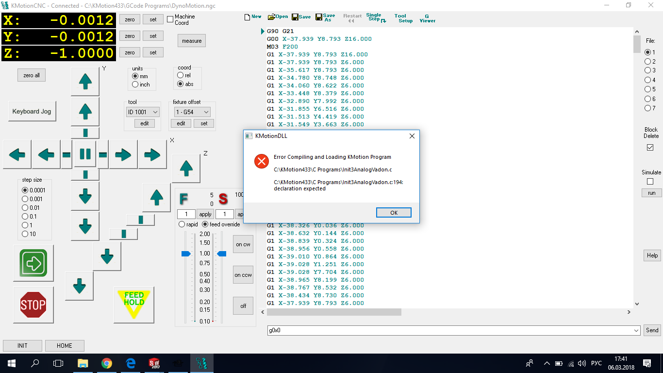 Подскажите куда копать, нажимаю INIT выскакивает ошибка. До этого двигал осями при первой настройке Кфлопа+Каналог
