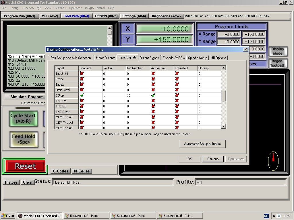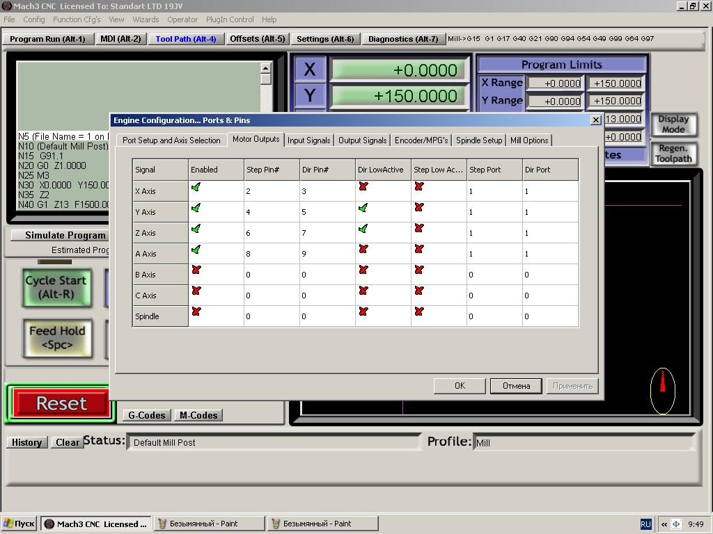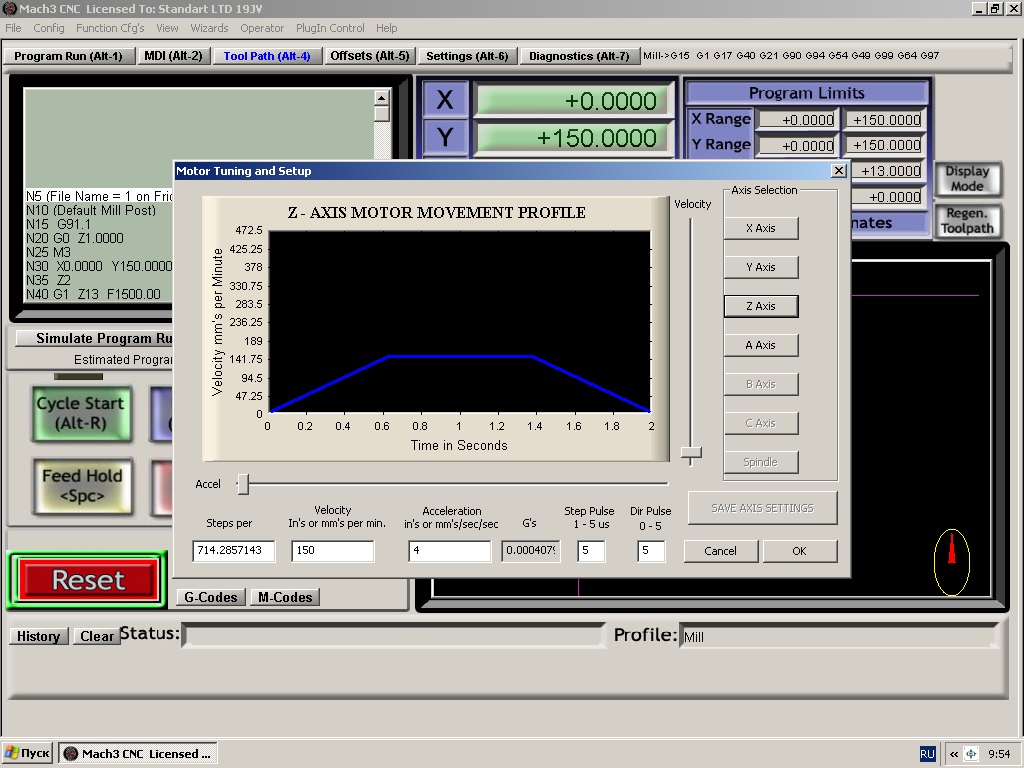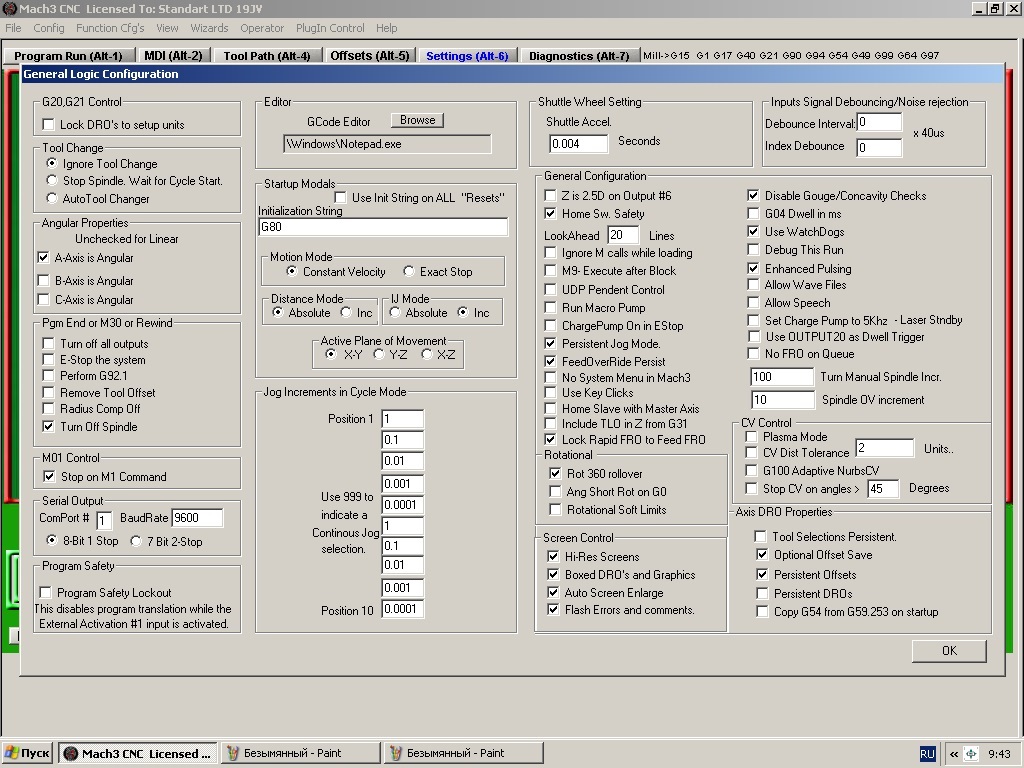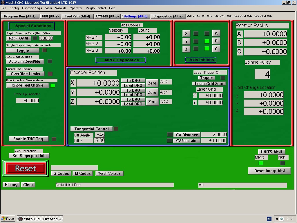 Пробовал менять в настройках все параметры, относящиеся к CV, но ничего не изменилось. Включал/выключал СV. Менял углы для подъема тангенциального ножа. Переустанавливал с нуля Mach 3. Кто-нибудь поможет разобраться? Почему нож не поднимается?!